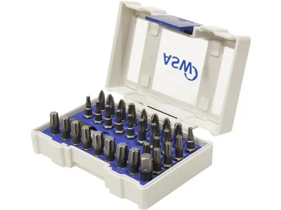 Bits af høj kvalitet i S2 Stål, sandblæst og matt. Sættet indeholder 30 bits, 1 adapter 1/4" til 1/4" firkant og 1 bitsholder med magnet og lynkobling - 60MM. 1xPH1 ; 2xPH2 ; 1xPH3 1xPZ1 ; 2xPZ2 ; 1xPZ3 3x TORX 10 ; 3x TORX 15 ; 4x TORX 20 ; 4x TORX 25 ; 4x TORX 30 ; 4x TORX 40.