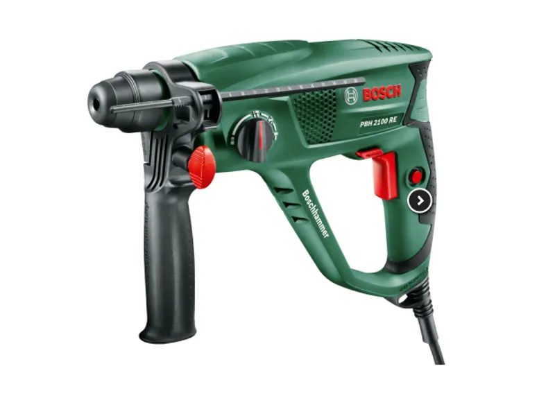 Bosch PBH 2100 RE. Chuck type: SDS Plus. Drilling diameter in concrete (max): 2 cm, Rated speed (max): 2300 RPM, Impact energy (max): 1.7 J. Power source: AC, Input power: 550 W, Output power: 270 W. Weight: 2.2 kg