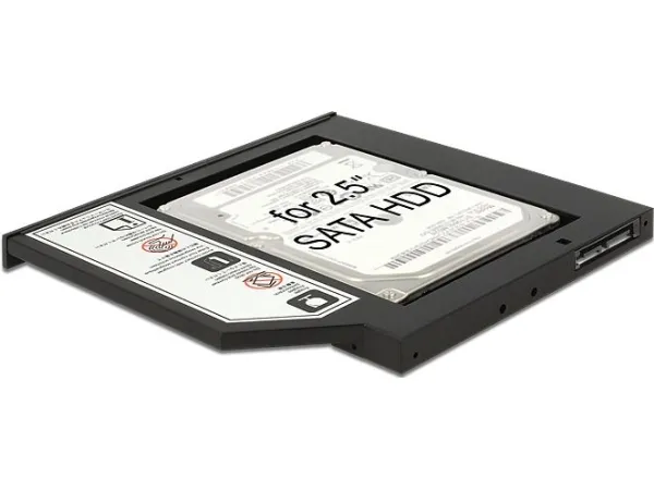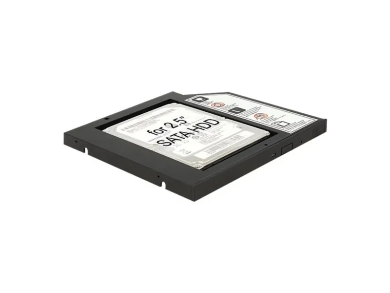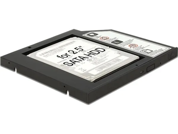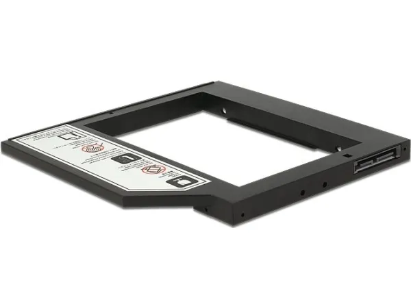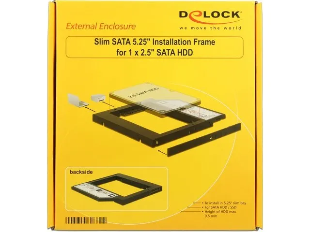 This Delock installation frame in slim-format can be installed into a 5.25? SATA slim bay in order to operate a 2.5? SATA HDD. The included universal front panel can be used, when you install the frame into a Mini PC or if your existing front panel of your laptop does not fit.