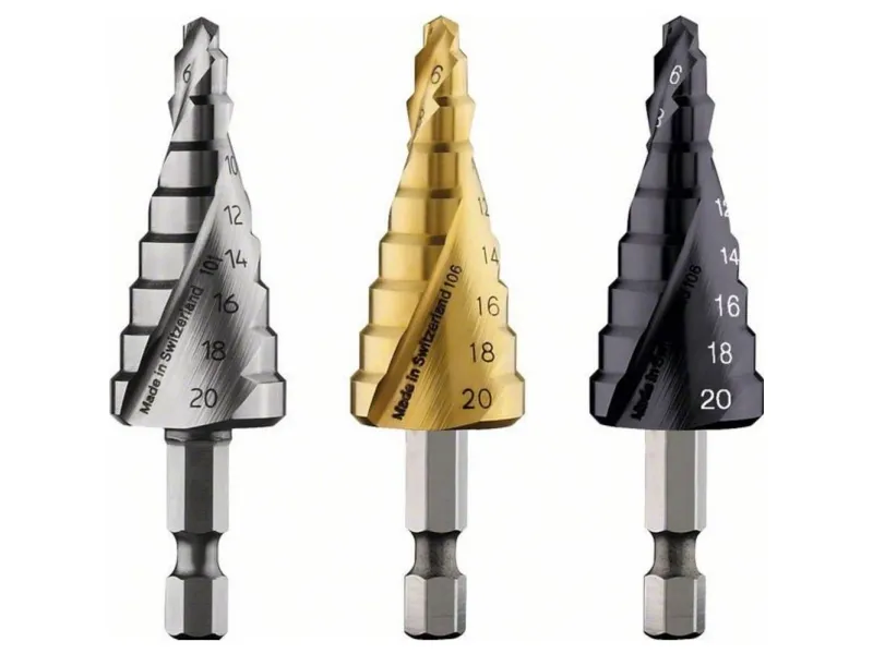Passer til næsten alle tynde materialer såsom. B. Ikke-jernholdige metaller, stål, plast eller rustfrit stål. Ingen forboring, grater i tynde plader. til afgratning, til runde huller, boring af en flerhed af diametre med et bor, boring af eksisterende huller. Spiral til længere levetid, færre vibrationer og hurtigere boring. Diameter mærkning i to spiraler. 3-overflade aksel mod udskridning i borepatronen. Fås i tre versioner:. HSS = 100% liv. HSS-TiN = 125% liv. HSS-AlTiN = 150% levetid (ingen køling påkrævet). 9 trin Ø 4-6-8-10-12-14-16-18-20 mm. 4 - 20 mm, 70,5 mm.