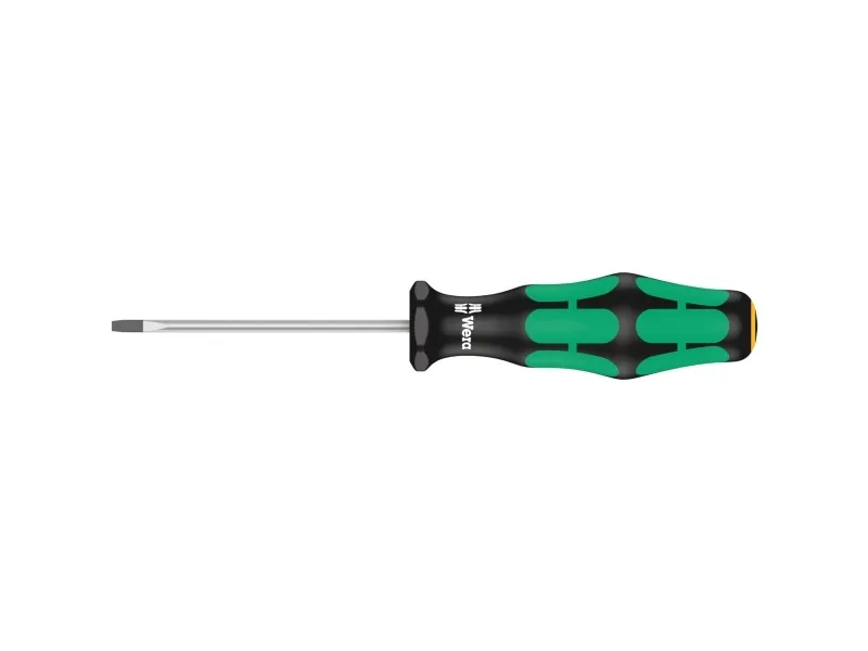 335 0,4 x 2,0 x 60 mm kærv-skruetrækker Kraftform Plus skruetrækkeren overfører flere kræfter med mindre anstrengelse, og skåner både hænder og arme - også ved langvarige arbejder. Takket være den fremragende tilpassede form på Kraftform-grebet kan der undgås skader som vabler og hård hud. Grebets hårde materialer (sorte gribezoner) sikrer et sikkert greb uden fare for at huden klæber fast. De bløde og skridsikre zoner muliggør en stor overførsel af kraft, uden tab. Markeringen af håndgrebet med skruesymbol og profilstørrelse gør det nemmere at finde skruetrækkeren i værktøjstasken og på arbejdspladsen. Den sekskantede afrulningsbeskyttelse forhindrer at værktøjet ruller væk. Med nøglehjælp til overførsel af et højere drejningsmoment. Kraftform Plus skruetrækker i høj kvalitet fra Wera. Flerkomponent kraftformet greb. Med sekskantet afrulningsbeskyttelse, der sikrer at den ikke ruller væk. Med grebgenkendelse for at gøre det lettere at finde og sortere værktøjetet. Kærvskruetrækker Flerkomponent kraftformet greb til hurtig og ergonomisk skruning Med værktøjsfinderen Take it easy: Farvemærkning efter profiler og størrelsesmærkning. Med sekskantet afrulningsbeskyttelse, der sikrer, at den ikke ruller væk Nicromat