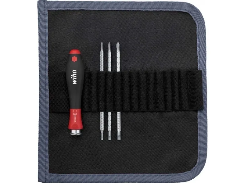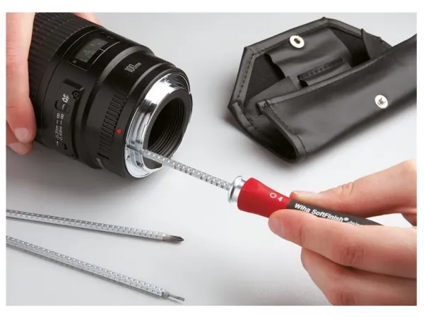 Simplifies your work\nAll tools securely arranged in a robust and clearly laid out bag.\n\nProtects your health\nWith the patented SoftFinish® handle design, ensuring work is kind to hands and muscles. Recommended by doctors and therapists at German Campaign for Healthier Backs.\n\nFacilitates handling\nEasy operation of the locking and unlocking button.\n\nSet constituent\n- 1x Screwdriver handle SoftFinish®-telescopic , Hexagon socket: 4,0 , Handle length: 105\n- 1x Screwdriver with interchangeable blade SYSTEM 4 , Slotted: 2,0 , Phillips: PH00\n- 1x Screwdriver with interchangeable blade SYSTEM 4 , Slotted: 3,0 , Phillips: PH0\n- 1x Screwdriver with interchangeable blade SYSTEM 4 , Slotted: 4,0 , Phillips: PH1