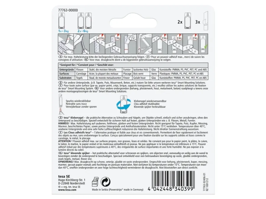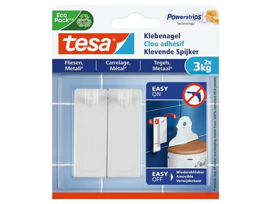 The tesa® Adhesive Nails for Tiles and Metal and the corresponding Adhesive Strips, included, can hold up to 3 kg per nail. They're specially designed to reliable hold decorative items and kitchen utensils on smooth and solid surfaces like tiles, most metals and plastics indoors. Easy and convenient mounting without the surface damage and hassle associated with a hammer or drill. The patented Powerstrips® Technology makes the Adhesive Nail removable in seconds, leaving no trace on your surface, and is reusable with a new tesa® Adhesive Strip.
