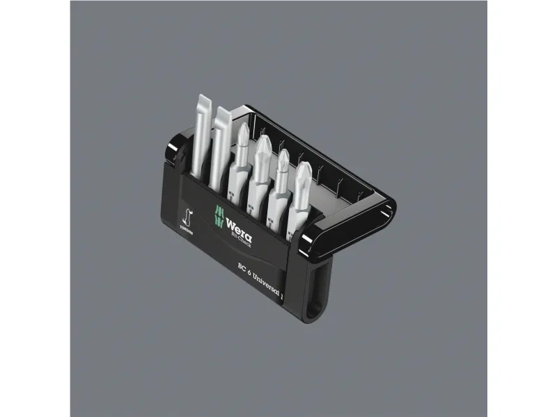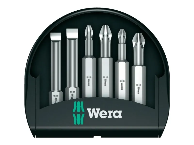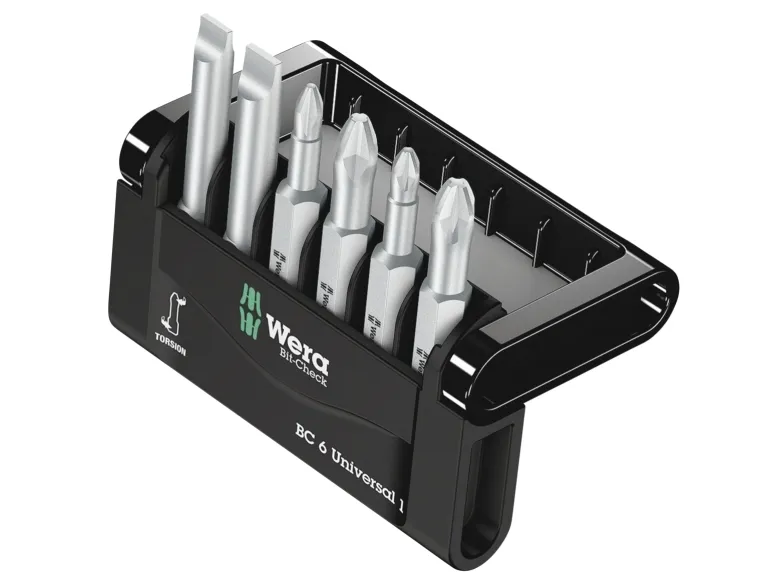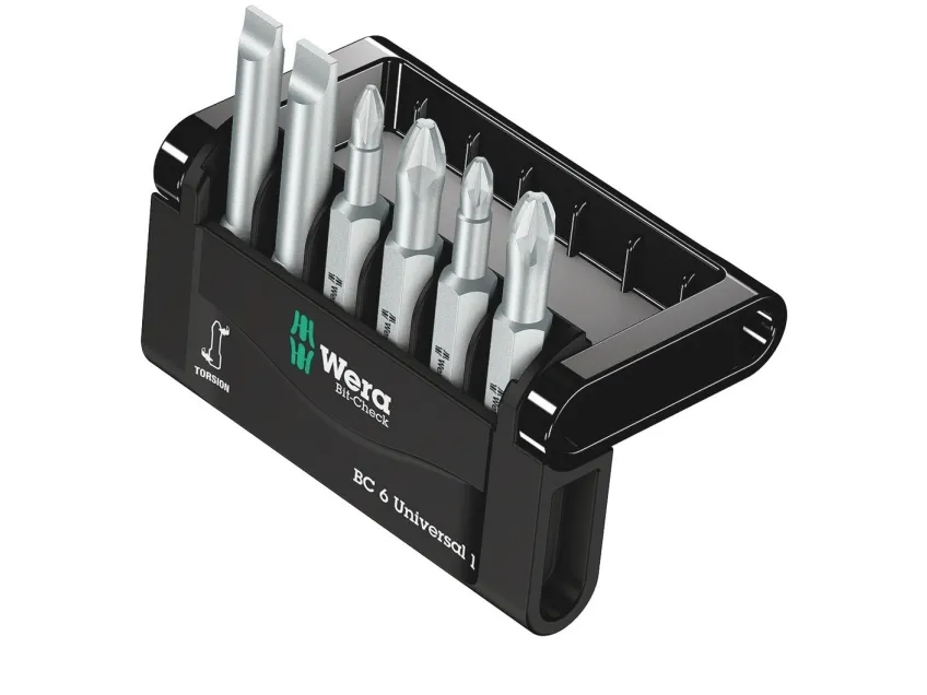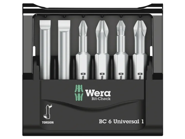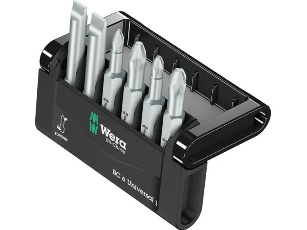6 50 mm-long Wera bits tidily arranged in a minimum of space in a practical Bit-Check. The tough viscous bits are suitable for universal use. In the case of the Torsion bits (TZ), torque peaks are additionally absorbed in the Torsion zone. This prevents premature wear and enhances the service life.