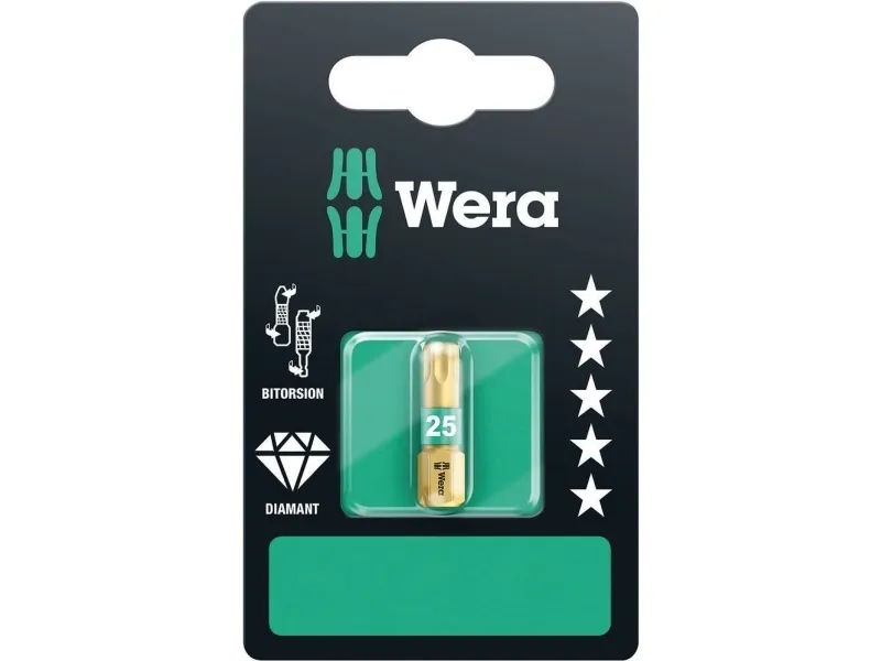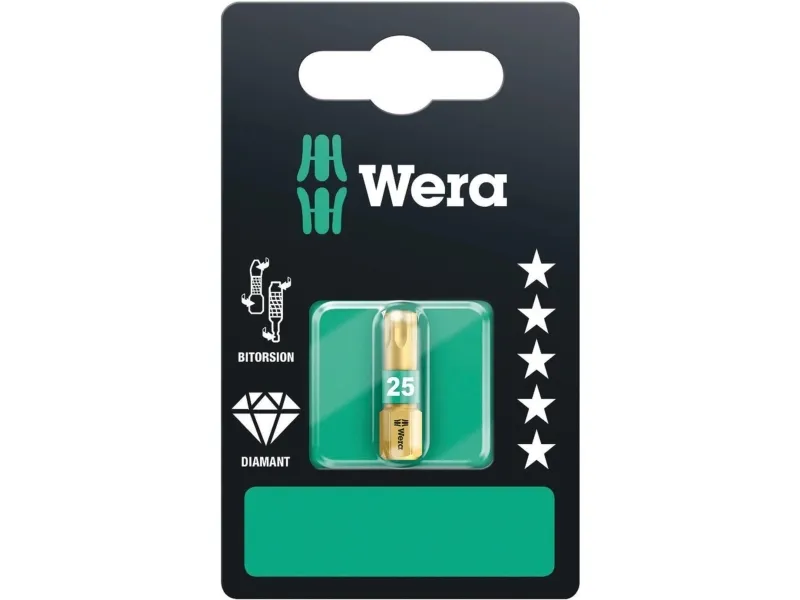 867/1 BDC SB TORX® bits, TX 10 x 25 mm BDC-bits er absolutte premium bits. Belastningen ved maskinelle forskruninger er ofte årsag til tidlig slitage af bits eller ødelæggelse af skruen. Disse belastningsspidser minimeres, du kan arbejde mere produktivt og sikkert. Et Wera BiTorsion-bit forebygger slitagen. Værktøjets levetid forlænges, og produktiviteten øges markant. Større belastning absorberes af torsionsvirkningen. Denne virkning opnås ved en målrettet varmebehandling efter hærdningen. Derved bliver skaftets hårdhed reduceret ift. spidsen. Bits 867/1 BDC Torx,, til skruer med Torx kærv, 1/4 sekskantstilslutning, BiTorsion for lang levetid, diamantbelægning for sikkert hold i kærven