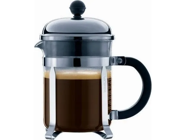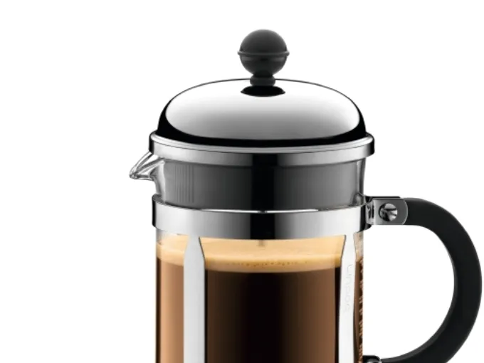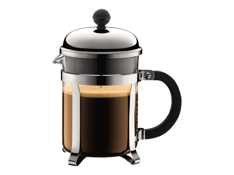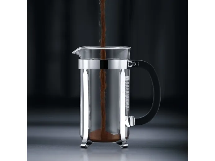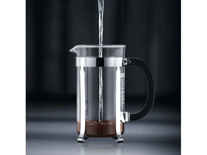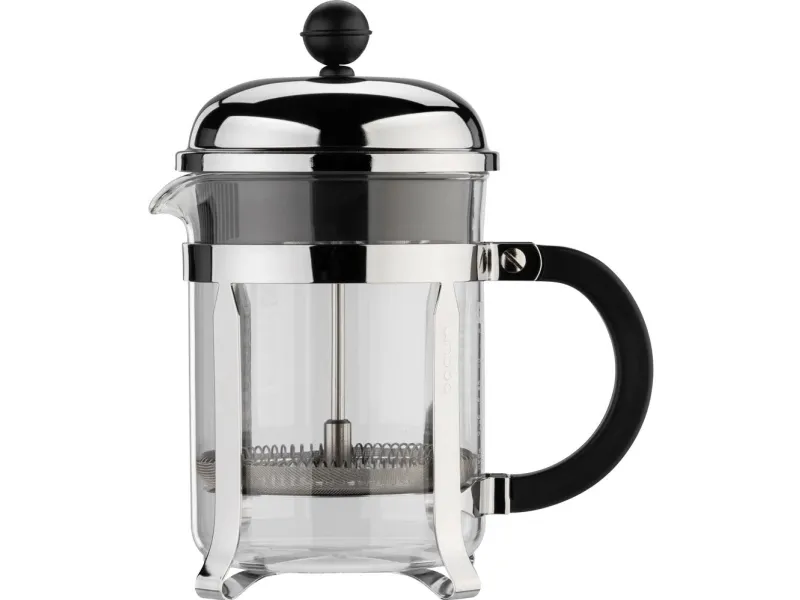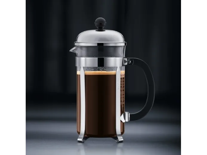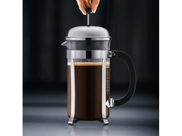 CHAMBORD is a true original – the classic French press coffee maker designed in the fifties. And we still produce it with the same painstaking craftsmanship we used way back when with the original. The frame and lid, made of steel, undergo several chrome plating processes to obtain a durable shiny surface that will last for many years of intense use. The only difference in the production process since the fifties is our commitment to the highest standards of environmentally correct manufacturing, which is especially important during the chrome plating process. The black CHAMBORD Polypropylene handle comes in a matte finish that not only gives a comfortable grip while serving but adds to the classic quality of the design. The French press system has always been the simplest and ultimate way of brewing an excellent cup of coffee. Using fresh coarseground beans with water between 92 and 96 degrees brings out the very best in all types of coffee.