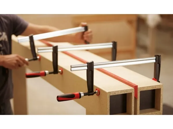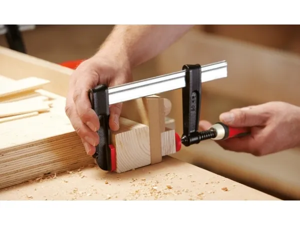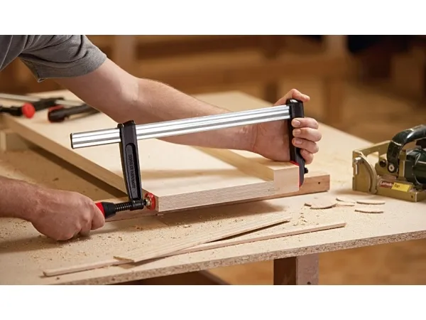 Temperguss-skruetvinge TPN-BE-2K 800/120 2-komponent-plastgreb af høj kvalitet · Med beskyttelseskapper på spændefladerne · Stabil hulprofilskinne med rifling Til spænding af træ inden for industri og håndværk.