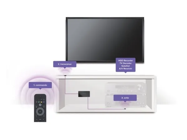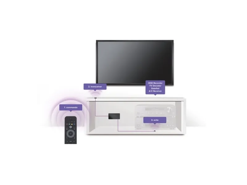 You place the receiver within your remote control's line of sight, having it connected to the module you placed inside the cabinet. You then connect the transmitter to the module. Your remote control's signal is transmitted via the receiver to the module, which returns the signal to the transmitter. The transmitter then 'operates' your audio visual equipment. This ensures that you do not have to open any cabinet doors in order to operate your equipment.