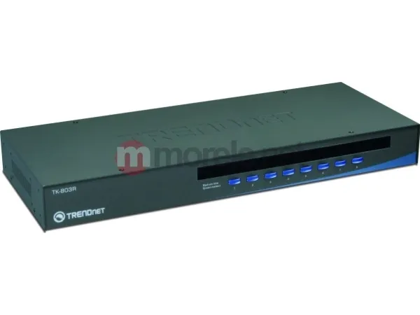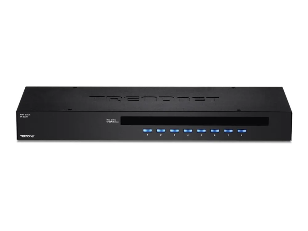 TRENDnet's 8-port rackmount VGA KVM switch, model TK-803R, lets you manage multiple computers with just one set of keyboard, monitor, and mouse. This rackmount USB KVM switch supports USB and PS/2 interface on the console side, and USB only on the PC side. Popular hardware platforms such as Windows, Linux, and Mac are supported. Users can switch between PCs using hot-key or push button for flexible management. Users can also hot-plug PCs on the fly to avoid downtime. The 8-port rackmount USB KVM switch is the perfect choice for managing multiple PCs.