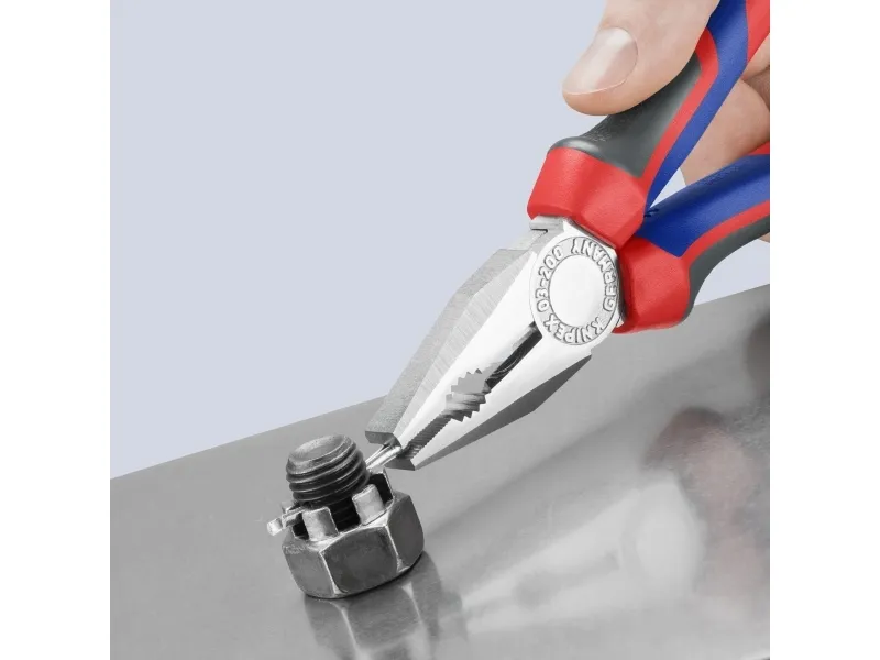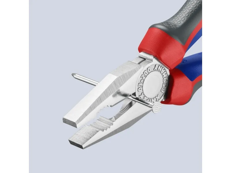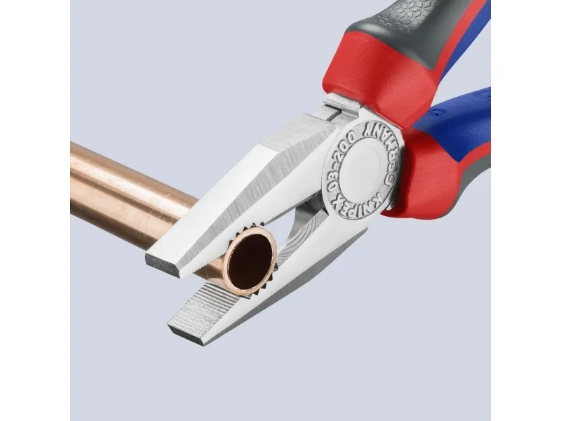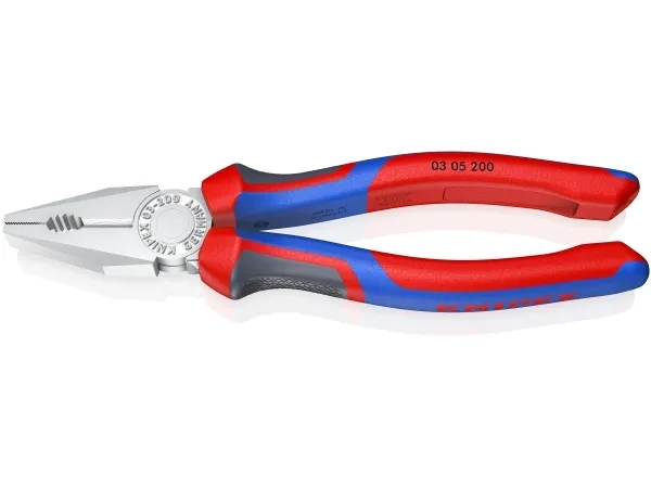 03 05 200 Kombinationstang Med gribezoner til fladt og rundt materiale til mangfoldige opgaver. Med skær til blød og hård tråd. Lange skær til tykkere kabler. Skær yderligere induktivt hærdede, skærhårdhed ca. 60 HRC. Med komfort-håndtag: fremstillet af tre ergonomiske komponenter til optimeret håndtering og med to KNIPEXtend-grænseflader til forlængelser.