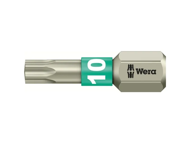TORX® bits, rustfrit stål, TX 10 x 25 mm Førsteklasses bits i rustfrit stål til indvendige TORX®-skruer. Wera værktøj er fremstillet af rustfrit stål, hvorved den uønskede fremmede rust undgås. Med torsionszone: Ved Torsion-bits bliver drejningsmomentsspidser i torsionszonen affjedret. Tidligt slid undgås, levetiden på bits øges. 1/4-sekskant, passer til holder i henhold til DIN ISO 1173-D 6,3