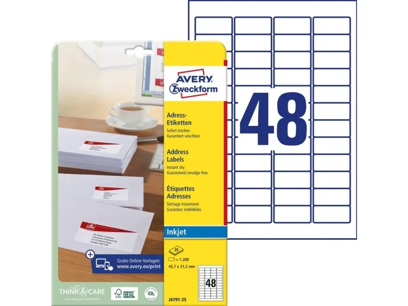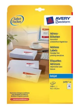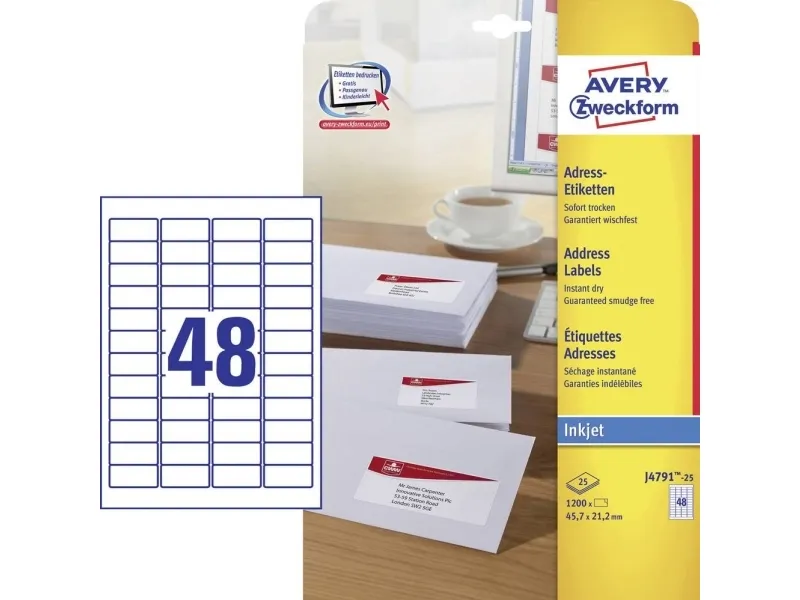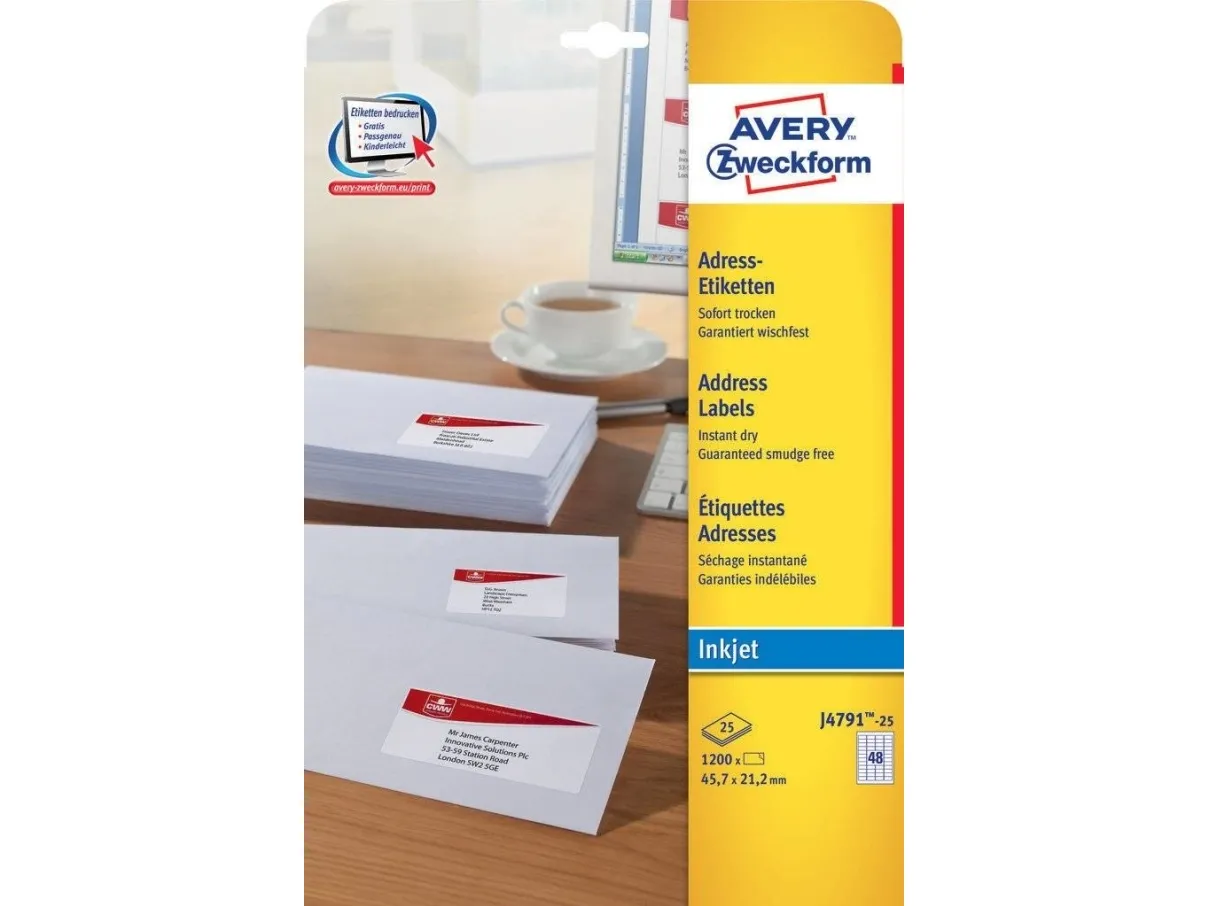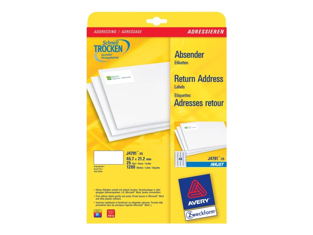 Avery Zweckform J4791 - Hvit - 21.2 x 45.7 mm 1200 etikett(er) (25 ark x 48 returadresseetiketter
