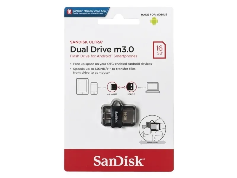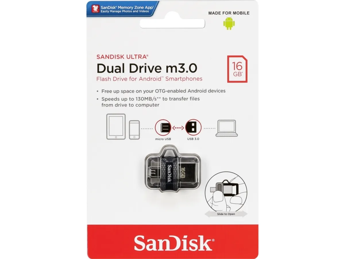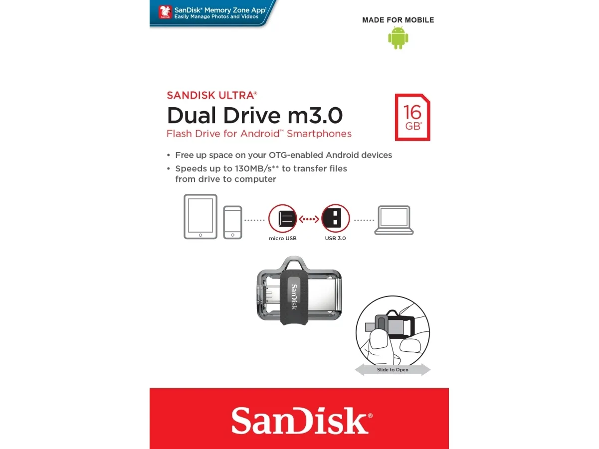 The SanDisk Ultra Dual Drive m3.0 makes it easy to transfer content from your phone to your computer. With a Micro-USB connector on one end and a USB 3.0 connector on the other, the drive lets you move content easily between your devices - from your Android smartphone or tablet to your laptop, PC or Mac computer. The USB 3.0 connector is high-performance and backward-compatible with USB 2.0 ports.