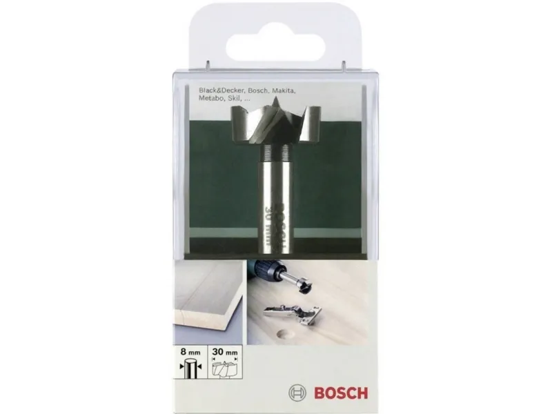 Forstnerbor, DIN 7483 g Forstnerbor, DIN 7483 g til præcis boring af beslagshuller. Et præcisionsbor med 2 knive og skævbider med kort centreringsspids. Boret udmærker sig ved høj skærekvalitet i borehullet, udrivningsfrie borehulkanter i hårdt og blødt træ og fineret træ med massiv trækerne. Med centreringsspids til præcis boring. Klingehårdhed min. 50 HRC. Hærdet krom-stål efter egen fabriksstandard. Reduceret cylinderskaft maks. 10 mm diameter.