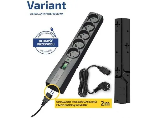 The Variant surge protector provides effective protection to the connected household or office devices against surges in the mains. The protector is dedicated for devices, such as desktop PCs and notebooks, peripherals, audio/video and multimedia devices. The protector features five grounded mains sockets with child protection system, preventing children from tampering with live elements. The protector's other functions combine an LED indicating, whether the surge protection is active, an automatic fuse for quick and easy reactivation of the protector and an illuminated, two-pole switch.