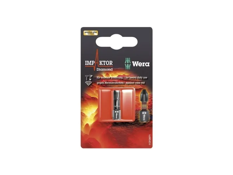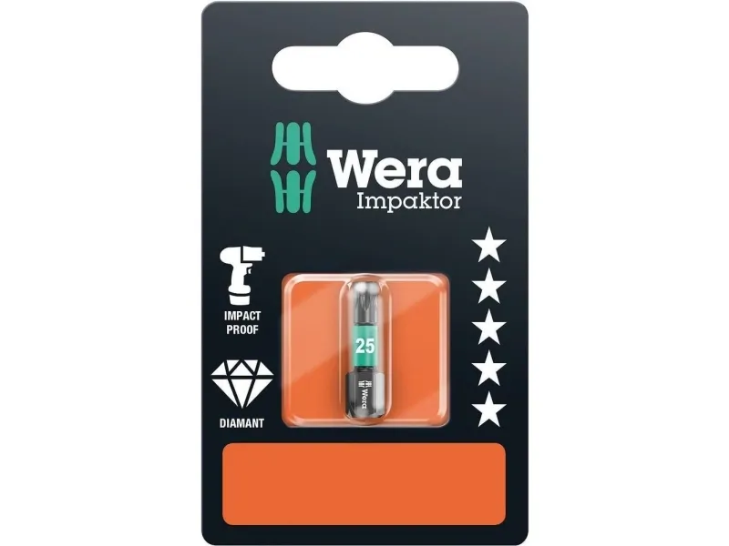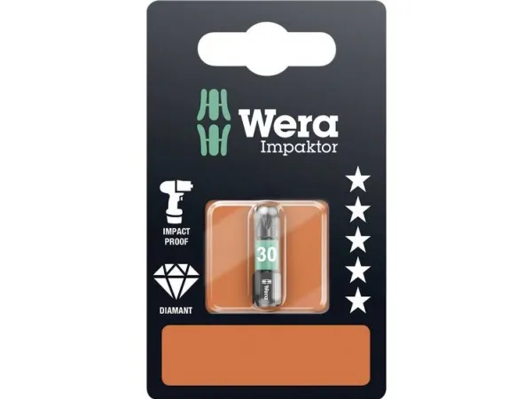 867/1 IMP DC SB Impaktor bits, TX 30 x 25 mm Diamantbelagt Impaktor-bit . Impaktor-teknologien sikrer med en optimal udnyttelse af materialeegenskaberne og en optimalt tilpasset geometri en mere end gennemsnitlig levetid, selv under ekstreme forhold; Særligt velegnet til brug med kommercielt tilgængelige impakt-/slagskruenøgler Den ru diamantbelægning på bitsene forhindrer takket være den forøgede friktionsmodstand, at skruen glider ud De bittesmå diamantpartikler bider sig fast i skruen ved skruning. Det kræver mindre kontakttryk, hvilket forhindrer træthed ved maskinel skruning. Bits 867/1 IMP DC Torx, til skruer med Torx kærv, 1/4 sekskantstilslutning, Impaktor-Teknikken sørger via den bedst mulige udnyttelse at materialeegenskaberne og via optimalt tilpasset geometri for en holdbarhed over gennemsnittet, også når der stilles ekstreme krav, særligt egnet til brug i almindelige impakt-/slagskruemaskiner, den ru diamantbelægning med forøget friktion nedsætter risikoen for at smutte ud af kærven