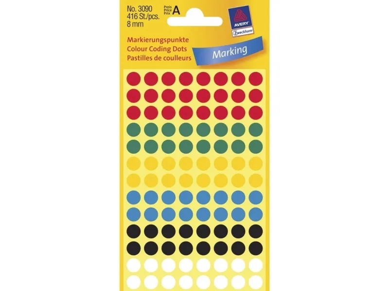 | • Fås i flere størrelser og farver • Til alle former for farvekodning • Permanent klæbende runde farvemarkeringsdots • Nemme at bruge |