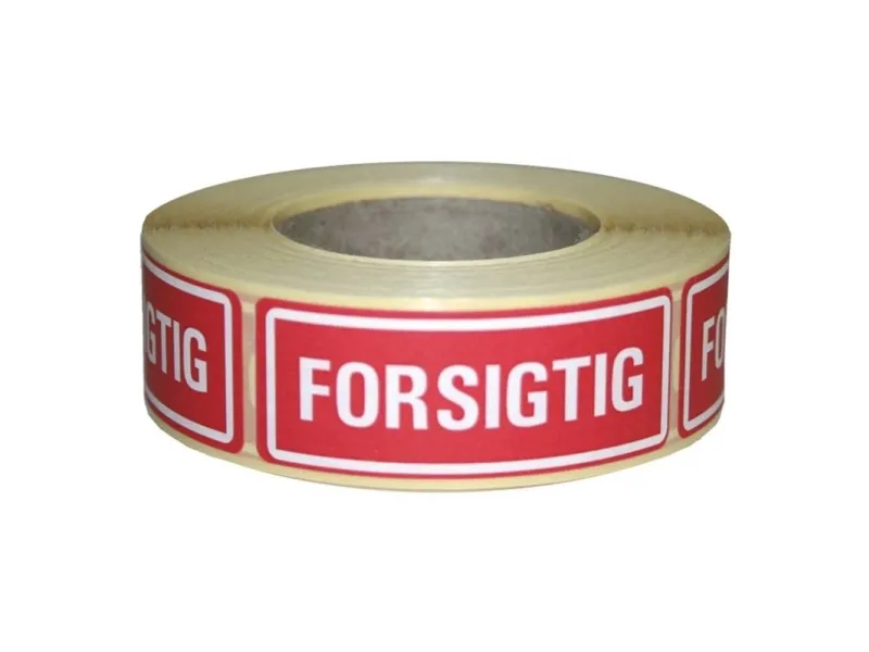 R�d selvkl�bende etiket i dispenser med hvid print: "Forsigtig" Format 24x64,6mm, 500 etiketter
