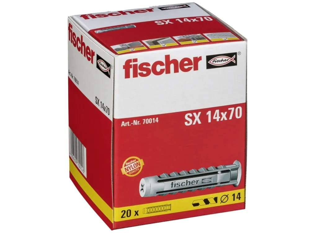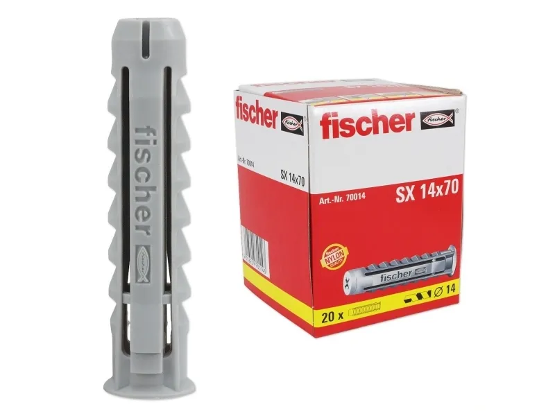 Due to four-way expansion, the fischer expansion plug SX optimally transfers forces into the building material. The high-quality nylon used in production and typical expansion guarantee a secure, permanent connection. The edge on the head of the fixing prevents the fixing from slipping into the drill hole. The fischer expansion plug SX is the best choice for fixing, e.g., lights, strips, bath and toilet installations, as well as lightweight wall cupboards.