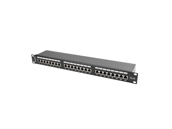 It is a passive part of structured cabling used for termination and organization of twisted-pair cables within 19" rack cabinets. Patch panels is equipped with 24 shielded RJ-45 ports category 5e.