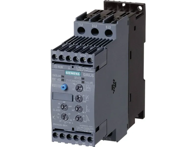 Soft starter S0, 12.5 A, 5.5 kW/400 V, 40 degrees, 480-200 V AC, 110-230 V AC/DC 3RW30: optimal tilpasning til drev opgave ved hjælp af enkelte potentiometer til start spænding (40...100%) og høj driftstid op til 20 s, kun blid opstart, montering besparelse med enkel 4-ledet motortilledning, 70 % pladsbesparelse ift. Stjerne-trekant-kombination, styre forsyningsspænding 110 - 230 V AC/DC. 3RW40: integreret iboende enhedsbeskyttelse forhindrer overbelastning af enheden, hånd- eller fjernstyret nulstilling er som standard · Elektronisk Motoroverbelastningsbeskyttelse, indstillelig strømbegrænsning · Forøgelse af ydeevnen ved opgradering med ventilatorer. SIRIUS soft starter S0 12.5 A, 5.5 kW/400 V, 40 °C 200-480 V AC, 110-230 V AC/DC Screw terminals Soft starter SIRIUS 3RW40 for standard applications for the soft starting and ramp-down of three-phase asynchronous motors. Soft starting, reduction of current peaks, prevention of supply voltage fluctuations during startup, reduction of load on the power supply network, reduction of mechanical load in the drive, considerable saving of space and wiring compared to star-delta (wye-delta) starters and frequency converters, maintenance-free switching and extremely easy handling. The integrated bypass allows a very compact construction and ensures low heat dissipation in the control cabinet. Intelligent monitoring functions protect the soft starter against overheating and the motor against overload. In addition, you can limit the current during startup to a settable maximum value. With the integrated remote reset, you can quickly and easily clear faults from a remote location. Worldwide approvals (e.g. IEC and UL/CSA), also for applications in hazardous areas (ATEX or IEC Ex). The 3RW soft starters are available for supply systems up to 690 V in a wide performance range with different control supply voltages and all with both screw and spring-loaded terminals. For the 3RW30/40 there are additional versions with 24 V control supply voltage. Some of the 3RW40 up to size S3, and all 3RW44 units also offer thermistor motor protection. With the optional link module, the soft starters can be attached to the circuit breakers, even for the versions with spring-loaded terminals. The optional fan permits an even more compact design in the control cabinet. Simple, efficient and always up to date - SIRIUS modular system.