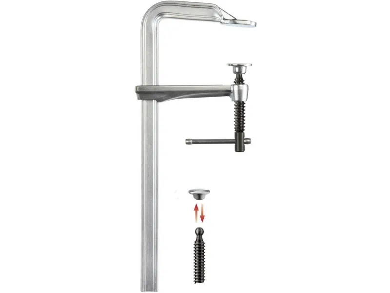 Kvalitetsskruestik i stål GZ-K 800/120 20 % mere spændekraft pr. spindeldrejning med optimeret skinneprofil · Maksimal sikkerhed takket være retlinjet kraftoverførsel på glidebøjlen · Hærdet glide- og fastbøjle til fjedrende og elastisk spænding · Håndtag med afrundede ender til enkel kraftoverførsel ved tilspænding · Værktøjsfri udskiftelige trykplader