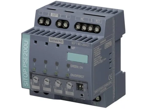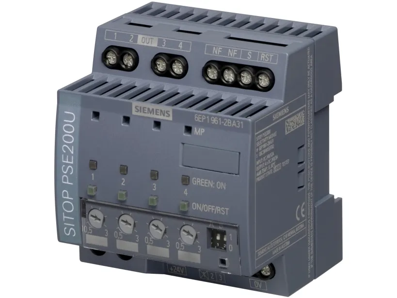 Valg modul SITOP PSE200U Pålidelig tur, uanset kabellængder eller kabeltværsnit · 4 load foderautomater per modul · Reduceret enhed mangfoldighed som hver udgang via potentiometer mellem 0,5 og 3 A og 3 og 10 A fint justerbar · Let konfiguration ved individuel kanalindstilling af den maksimale strøm · spot lysdioder til hurtig fejlfinding · sum signalering kontakt til ekstern diagnose · remote reset fra en central placering mulig · Enkel idriftsættelse ved manuel on / off styring af kanaler med reset-knap · Sekventiel skift af foderautomater til at reducere det beløb startstrøm · Plomberbar gennemsigtigt låg af den nuværende - og tidsindstilling til beskyttelse mod ændring. Bemærk! Dette produkt er blevet maskineoversat.
