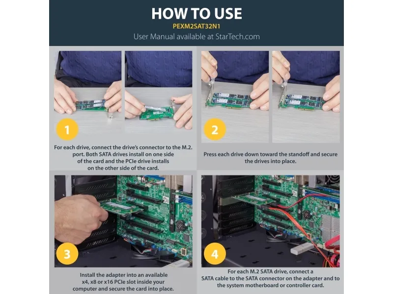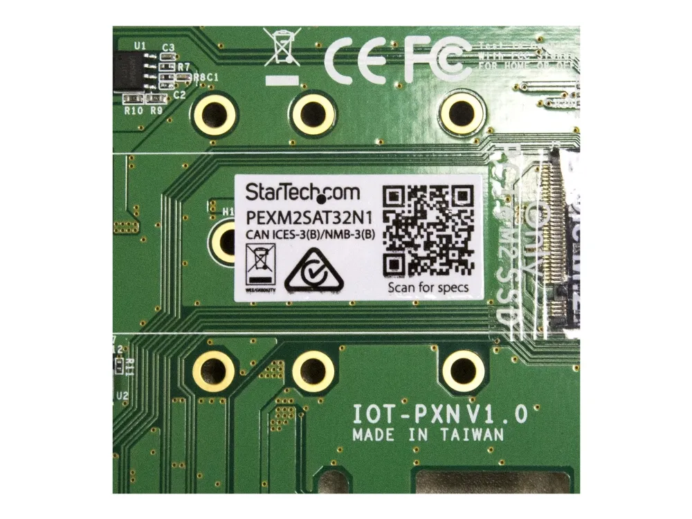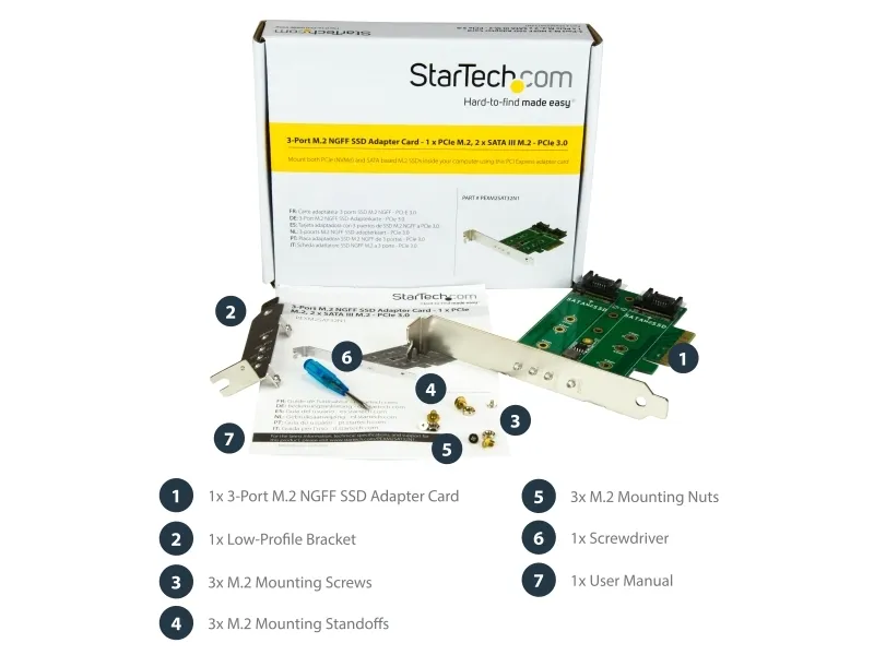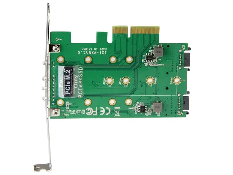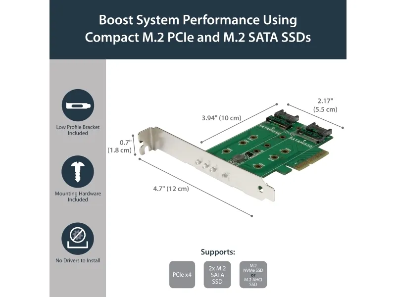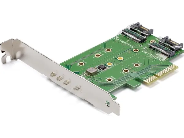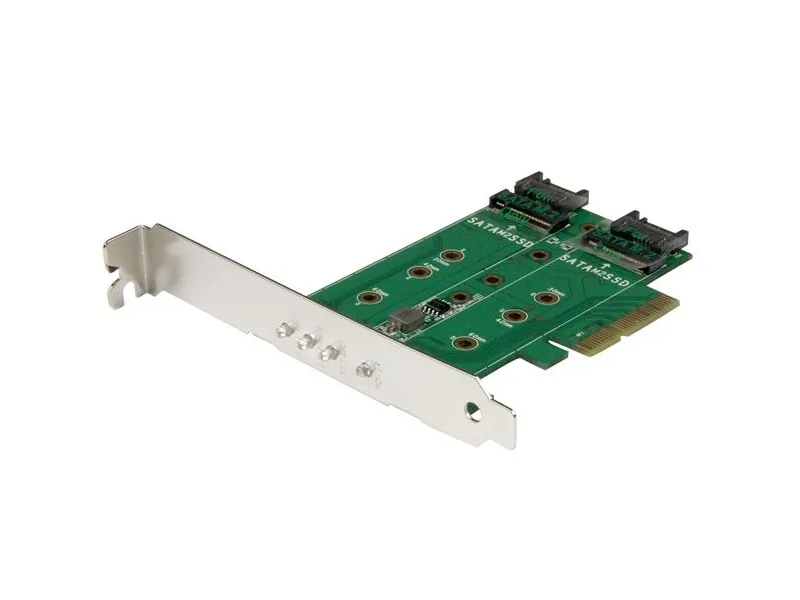 Mount both PCIe (NVMe) and SATA based M.2 SSDs inside your computer using this PCI Express adapter card. This 3-port M.2 SSD adapter card is one of the only cards that supports both PCIe and SATA-based M.2 SSDs (solid-state drives). It's a versatile way to expand the overall storage capacity of your desktop PC or server. Plus, because it supports a high-speed PCIe M.2 drive, you can increase the speed and performance of your computer.