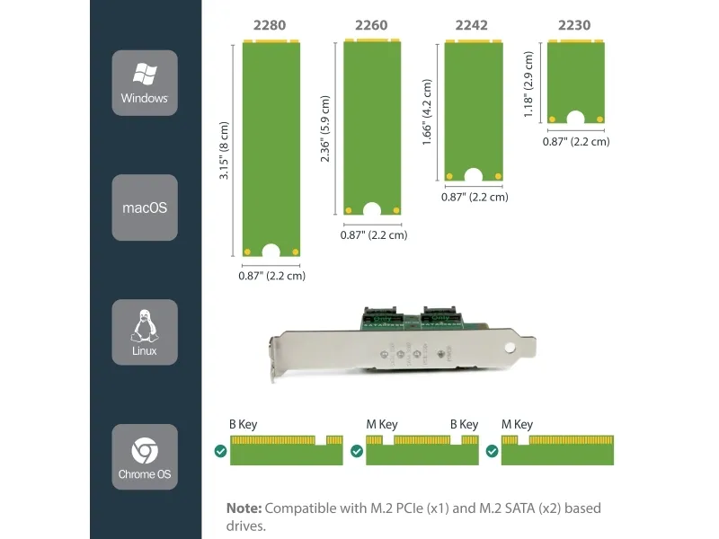 You can rest assured that your M.2 SSDs are compatible with the adapter card. It supports the most common drive sizes, including, 2280, 2260, 2242 and 2230.