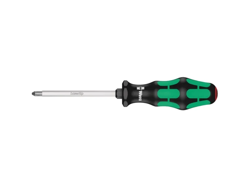 350 SK PH Krydskærvsskruetrækker, PH 3 x 150 mm Kraftform Plus skruetrækkeren overfører flere kræfter med mindre anstrengelse, og skåner både hænder og arme - også ved langvarige arbejder. Takket være den fremragende tilpassede form på Kraftform-grebet kan der undgås skader som vabler og hård hud. Grebets hårde materialer (sorte gribezoner) sikrer et sikkert greb uden fare for at huden klæber fast. De bløde og skridsikre zoner muliggør en stor overførsel af kraft, uden tab. Markeringen af håndgrebet med skruesymbol og profilstørrelse gør det nemmere at finde skruetrækkeren i værktøjstasken og på arbejdspladsen. Den sekskantede afrulningsbeskyttelse forhindrer at værktøjet ruller væk. Med nøglehjælp til overførsel af et højere drejningsmoment. - Hvordan kan jeg forhindre, at den hopper ud af skruehovedet? Det sker ofte, at værktøjet hopper ud når man er i gang med at skrue skruen i. Nogle gange sker det endda, at skruen glider mens komponenterne står under spænding. Spidsen på Wera lasertip-skruetrækkere er mikroskopisk fint opruet med laserstråler. Denne ru overflade bider sig helt fast i skruehovedet. Dette giver ro i sindet, når der arbejdes under spænding. Med laserbehandlingen er der indpræget en mikrorå overflade med en kanthårdhed på over 1000 Vickers. Den bider sig formfast i skruehovedet. Fordelen: Mindre risiko for at glide, højere sikkerhed. Skruetrækkersæt leveres med et stativ, der kan monteres på væggen. På denne måde er en ordentlig opbevaring og en hurtig adgang sikret. Skruetrækker 350 SK PH, til skruer med Phillips kærv, klinge sekskant, str. 1-3 med sekskant til fastnøgle, Kraftform med rullestop