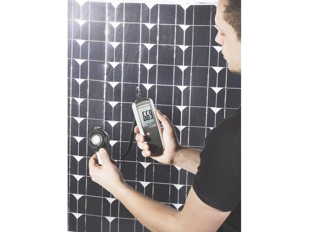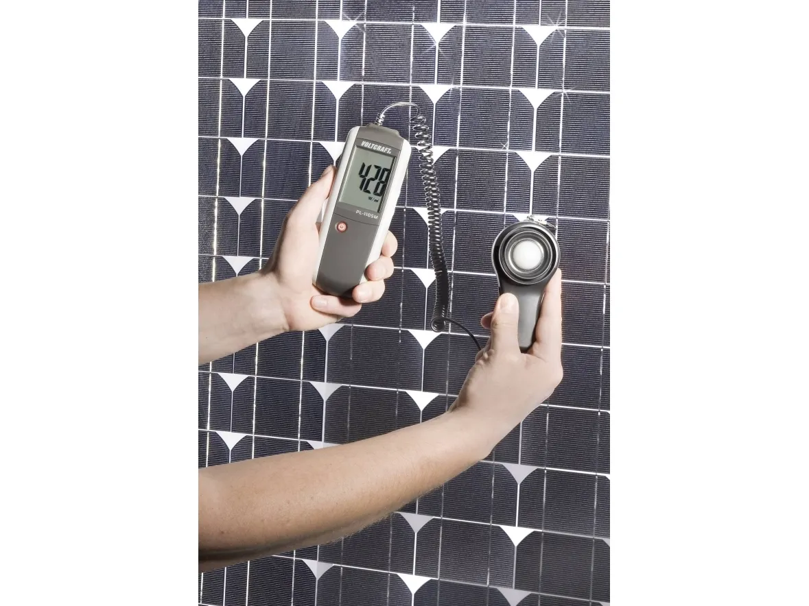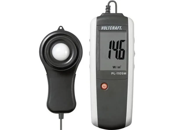 Solcelle-indstrålingsmåler Voltcraft PL-110SM Måling af min.-/maks.-værdi · Måleværdi W/m² eller BTU (ft²xh) kan omskiftes · Data-Hold · Robust hus med tilsprøjtet gummibeskyttelse. · Baggrundslysning. Robust måleapparat, der er nemt at betjene, og som måler solindstrålingens intensitet i W/m². Ved hjælp af dette apparat kan du nemt og sikkert måle et PV-anlægs eller solcelleanlægs virkningsgrad. Du skal blot måle solindstrålingen pr. m², omregne tallet i forhold til PV-anlæggets nominelle ydelse og sammenligne tallet med den aktuelle nettilslutning. Med PL-110SM kan du ligeledes fastslå den ideelle placering af et nyt anlæg. Måling af solindstrålingens intensitet Ideel til kontrol af PV-anlægs virkningsgrad Måleområde Pstrømløs 0 - 1999 W/m²