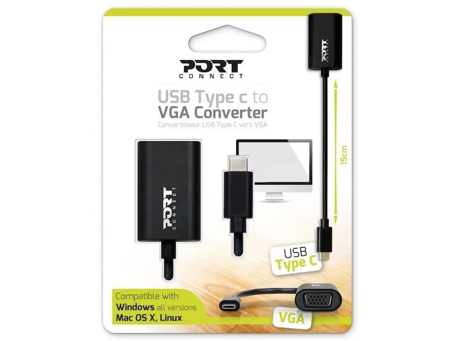 The PORT Connect from PORT Designs is a versatile USB-C to VGA adapter designed to bridge the gap between your modern devices and traditional display monitors. With support for a maximum output resolution of 1920 x 1200 and a 60 Hz refresh rate, it delivers high-quality visuals and smooth video playback, making it ideal for presentations, movie watching, and extensive data analysis. The adapter comes equipped with both USB and VGA cables, offering flexible connection options to meet your various needs. Its Plug-and-Play design ensures a straightforward setup, allowing you to connect your devices quickly without the need for additional drivers or software. Whether you're in the office or working from home, this adapter is a reliable solution for enhancing your productivity and viewing experience.