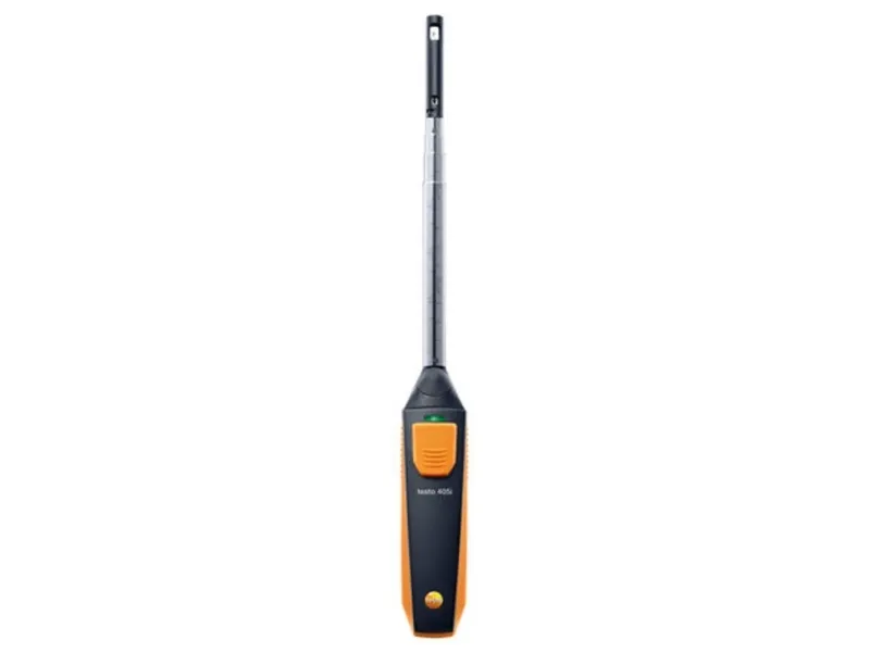 Kompakt Profi-måleapparat fra testo Smart Probes-serie til brug med smartphones/tablets · Måling af lufthastighed, temperatur og volumenstrøm Varmetråd-anemometer testo 405i bliver i kombination med en smartphone eller tablet til et kompakt måleapparat for lufthastighed, temperaturer og volumenstrøm. Den 400 mm udtrækkelige teleskopstang gør anvendelsen mere fleksibel i rum og kanaler. Via testo Smart Probes app kan brugeren bekvemt aflæse sine måleværdier, konfigurere volumenstrømmålinger nemt og hurtigt, samt bestemme tidslige og punktvise middelværdier. Slutteligt kan de målte data-protokoller sendes direkte som PDF- eller Excel-filer. I forbindelse med termo-hygrometer testo 605i egner testo 405i sig også til bestemmelse af køle- og varmeeffekter.