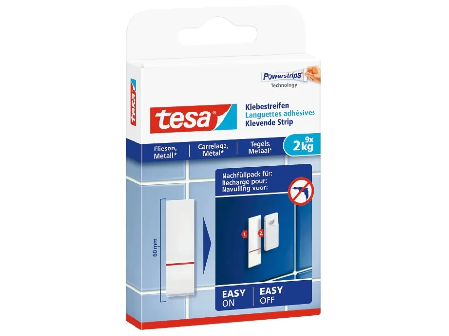 tesa® Adhesive Strips for Tiles & Metal 2 kg are the refill for the Adhesive Nail for Tiles & Metal 2 kg. They allow the nail to be used repeatedly – great for your wallet and for the environment. You can also use them on their own to mount objects directly onto the wall. Put up pictures and decorations wherever you want and because they're removable without a trace, you can move things around whenever you want a change of scene.