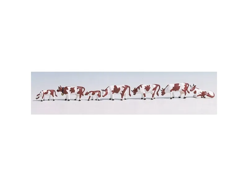 The "Cows, Brown & White" figure set contains 9 animal figures, all resembling brown and white cows of various sizes and shapes and in different poses.