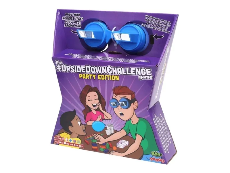 The #UpsideDownChallenge Game Party Edition: In The #UpsideDownChallenge Game Party Edition, players compete to do challenges with the included accessories like bouncing a ping pong ball, stacking 10 blocks, making a figure 8 knot and more, all with their vision flipped upside down when wearing the #UpsideDownChallenge goggles. Even the simplest tasks become difficult when the world is flipped upside down! It includes: 1 Pair of #UpsideDownChallenge goggles, 30 Action Challenge cards for beginners and experts, 10 Create Your Own Challenge cards, 1 Ping Pong ball, 1 bandage, 1 set of 10 balloons, 1 Set of 25 blocks, 5 straws and 1 Instruction manual.