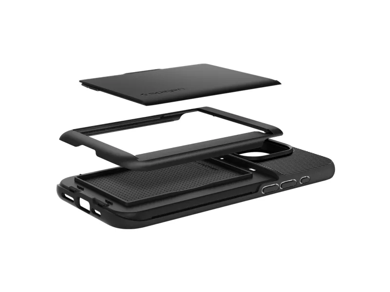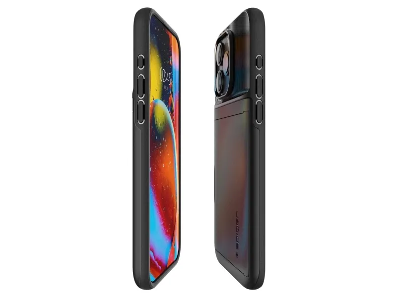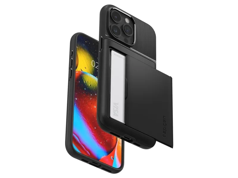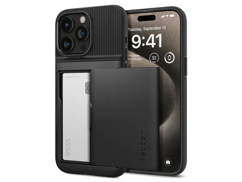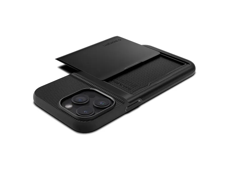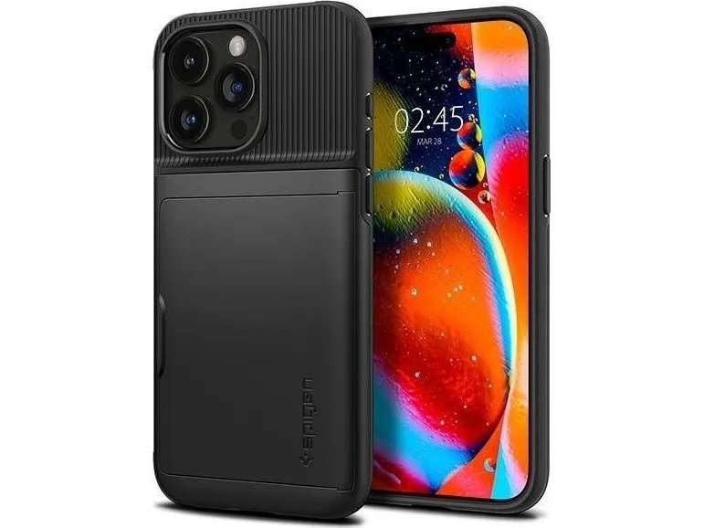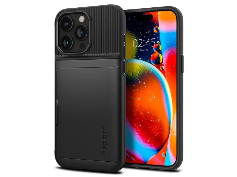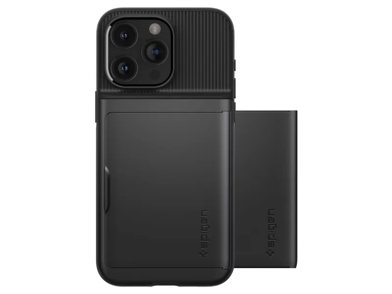 Expand your pocket real estate. The Slim Armor CS makes your iPhone the only thing you need to carry. Its sturdy built-in wallet secures up to two cards and your phone from drops. Make the smart move and drop the bulky wallet. We got you. Spigen ACS06589. Case type: Cover, Brand compatibility: Apple, Compatibility: iPhone 15 Pro Max, Maximum screen size: 17 cm (6.7"), Surface coloration: Monochromatic, Product colour: Black, Number of card pockets: 2