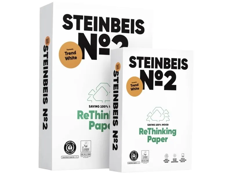 STEINBEIS No. 2 Universal printerpapir kontorpapir STEINBEIS No. 2 fremstilles af 100% genbrugspapir uden anvendelse af klor eller klorholdige blegemidler. Papiret har fået tildelt den blå engel og EU-Ecolabel. Produktet kan genbruges fuldstændigt efter brugen. STEINBEIS No. 2 kan anvendes til alle gængse laser- og inkjetprintere. På grund af det bæredygtige fiberråmateriale og fremstillingsprocessen på en integreret fabrik er det et økologisk alternativ til alle dokumenter af friske fibre.