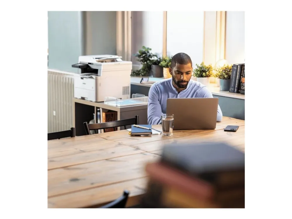 Efficiency is at the core of this device, featuring an automatic document feeder (ADF) with a capacity of 50 sheets and a standard media capacity of 250 sheets, supporting a wide range of media sizes and types. High-quality printing and copying are achieved with a resolution of 600 x 600 DPI, alongside automatic duplexing and speeds of up to 18 ppm for both color and B/W printing. Moreover, its eco-friendly design, certified by ENERGY STAR and Blue Angel, ensures reduced environmental impact and operational costs, making the MFC-L3740CDWE a suitable choice for any eco-conscious business.