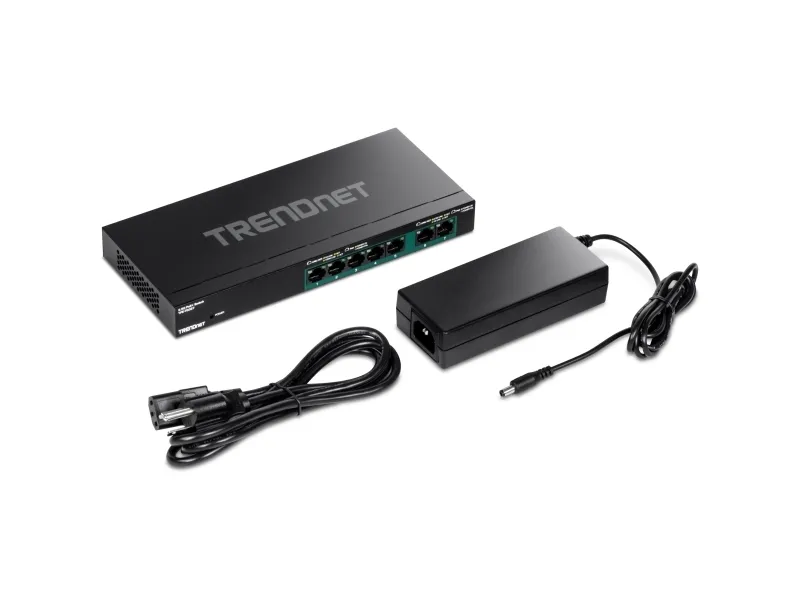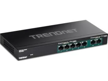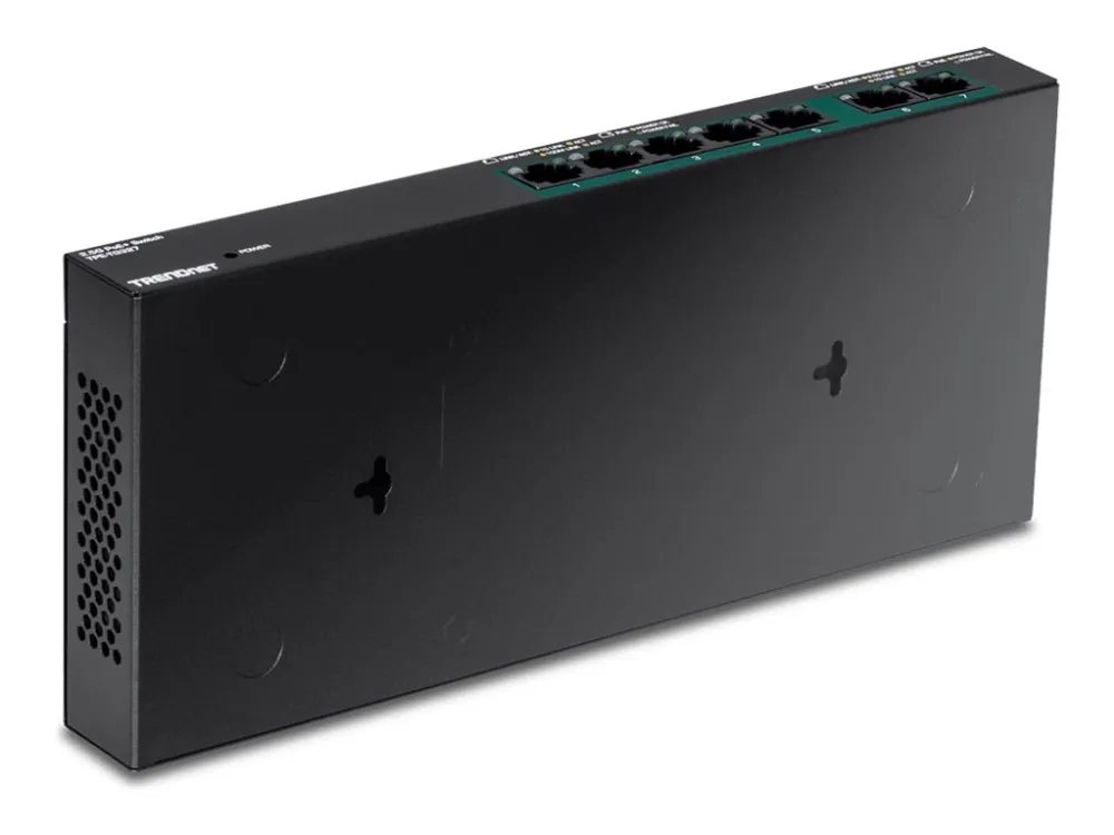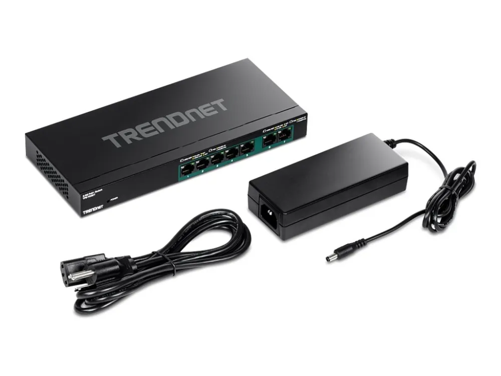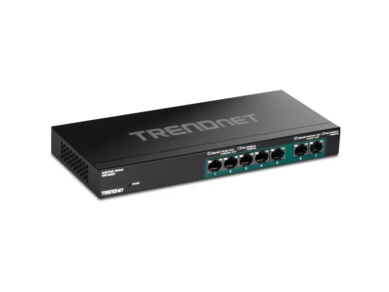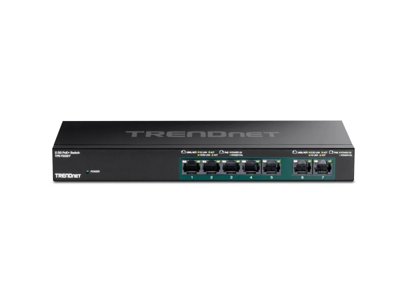 TRENDnet's 7-Port Multi-Gig PoE+ Switch, model TEG-TG327, is an affordable 2.5G PoE+ switch that provides advanced high-bandwidth performance, ease of use, and reliability. The TEG-TG327 multi-gig switch offers two dedicated 2.5G PoE+ ports and five dedicated 1G PoE+ ports for high-speed network connections with a 20 Gbps switching capacity. Having a sturdy compact metal housing and fanless design, the multi-gig PoE+ switch is a cost-effective solution for high-speed network connections. A 70 W total PoE power budget on this affordable multi-gig PoE+ switch supplies up to seven PoE+ devices with up to 30 W per port.