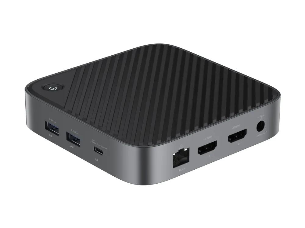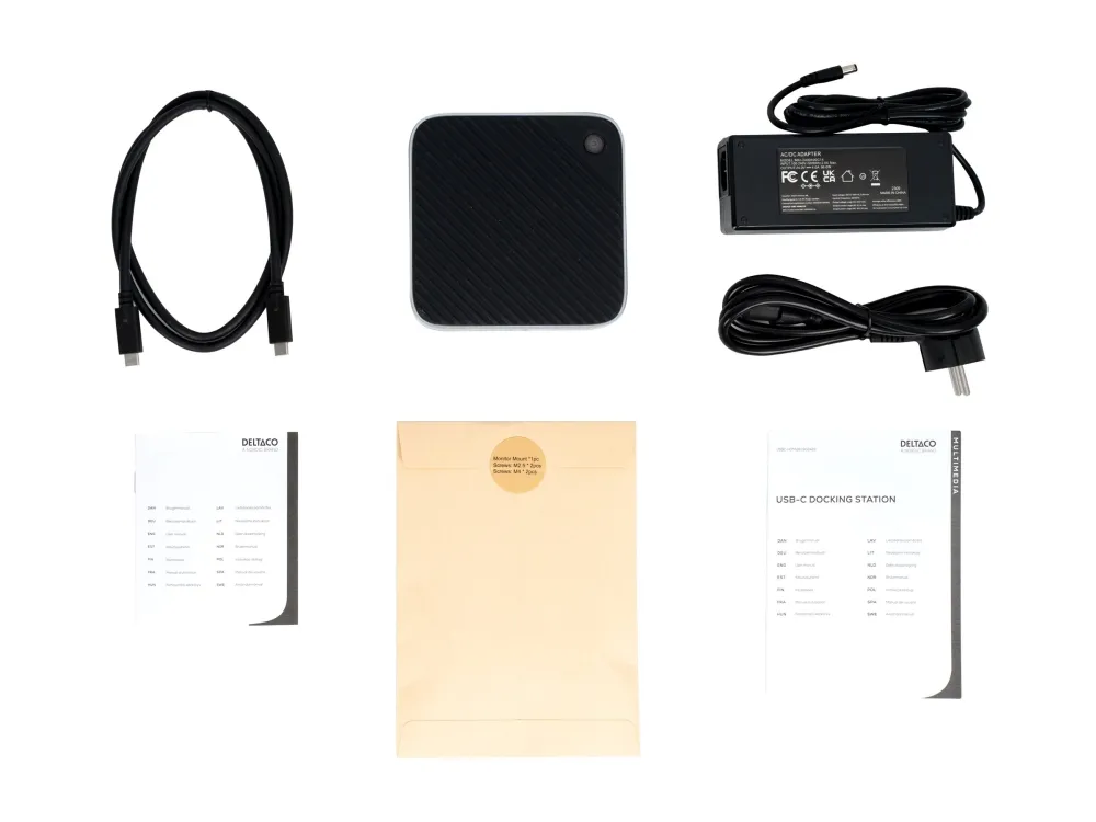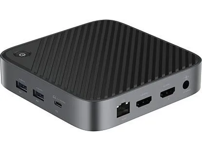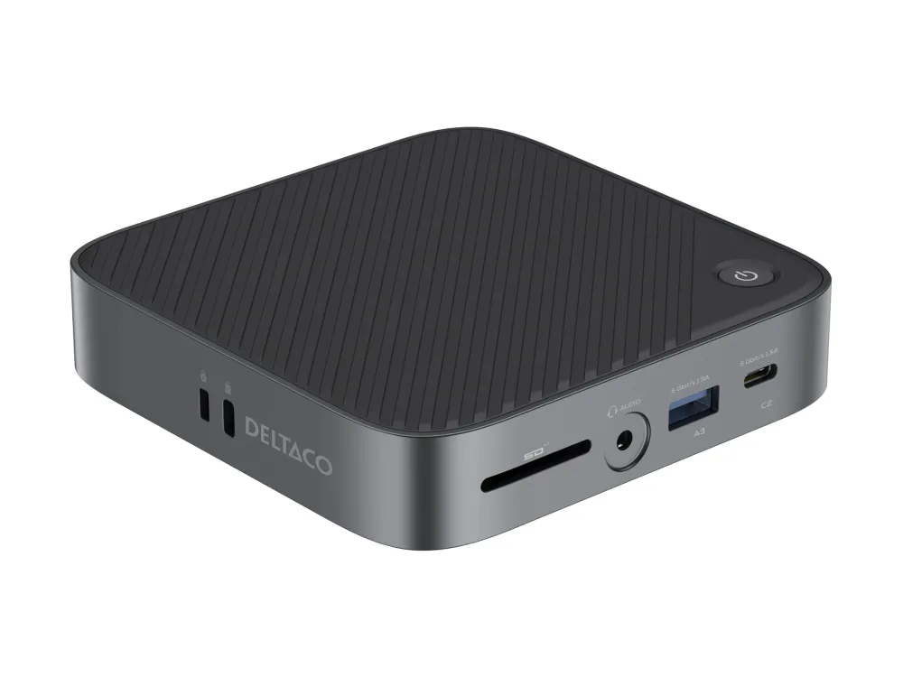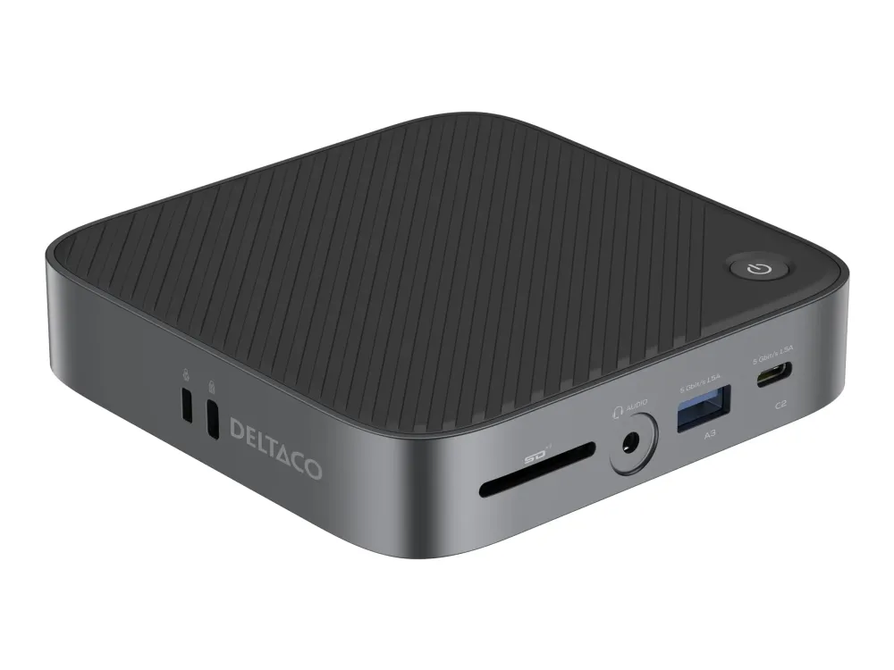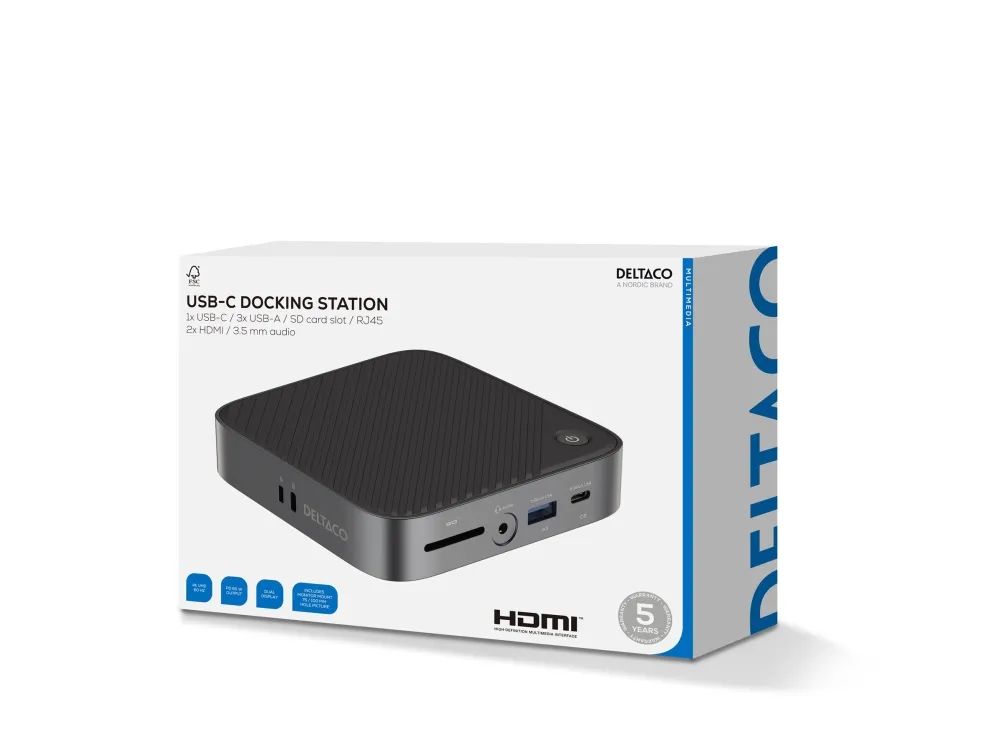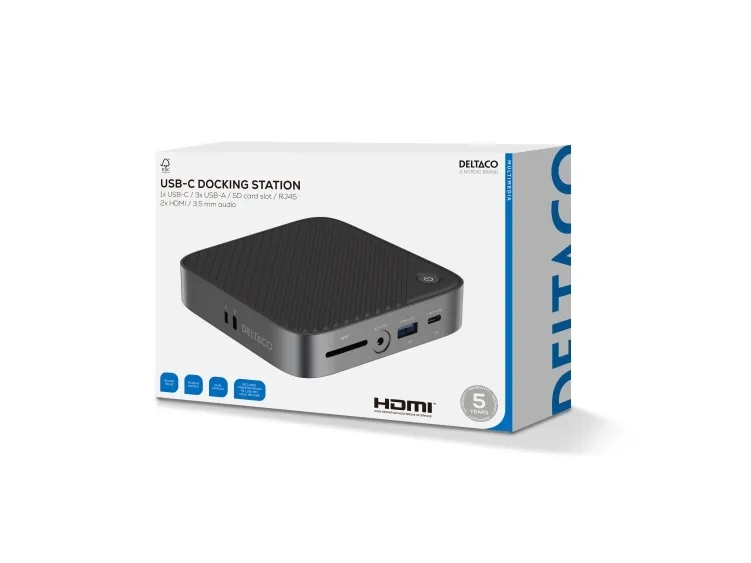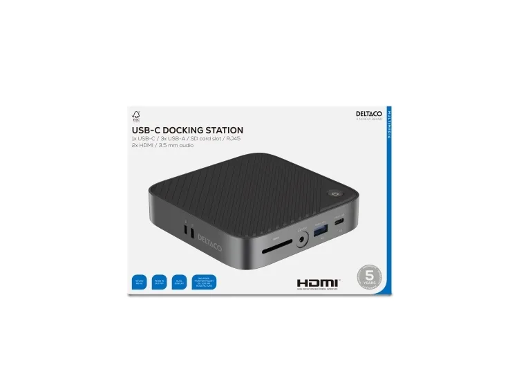 1 x USB-C med Power Delivery (65 W) - 24 pin USB-C 3 x USB-A - 9-pins USB-type A 1 x nettverk - 10/100/1G Ethernet - RJ-45 2 x skjerm/video - HDMI - 19 pin HDMI Type A 1 x hodetelefoner - 3,5 mm telefonjakk