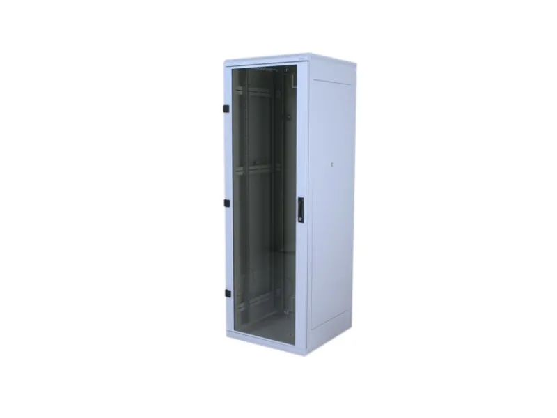- Hinged front door with lockable swing handle typically with glass but may be solid steel or perforated as required. The 180° hinge design permits easy removal of the door or when needed a change of direction of door opening. - Removable side and rear covers secured with key operated locks. - Cable entry points in the top, bottom and upper and lower rear sections of the cabinet. Each entry point is covered by a breakout style blanking panel. Square area of cable enrty opening is now bigger( 333cm2 ). - Two pairs of vertical 19” fixing rails which can be adjusted infinitely back and forth in the depth of the cabinet are attached to each side. In 800mm square versions the frame may also be adjusted across the width of the cabinet. - Openings are provided in the base and top of the cabinet for fan units. Top fan opening is covered by a 3D cover. - A brush strip to restrict ingress of dust through the chosen cable entry opening. - Adjustable mounting and levelling feet. - Vented top and bottom sections for natural convective ventilation. - Earthing system. - Supply with elementary mounting material.