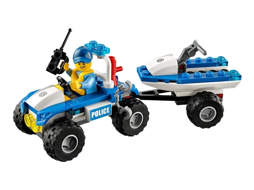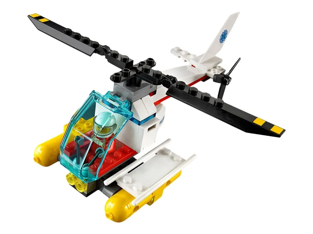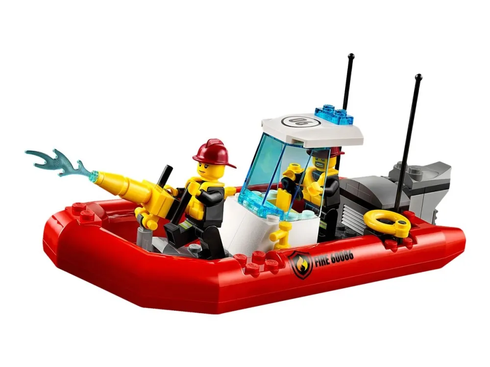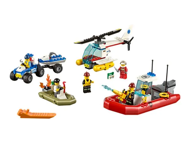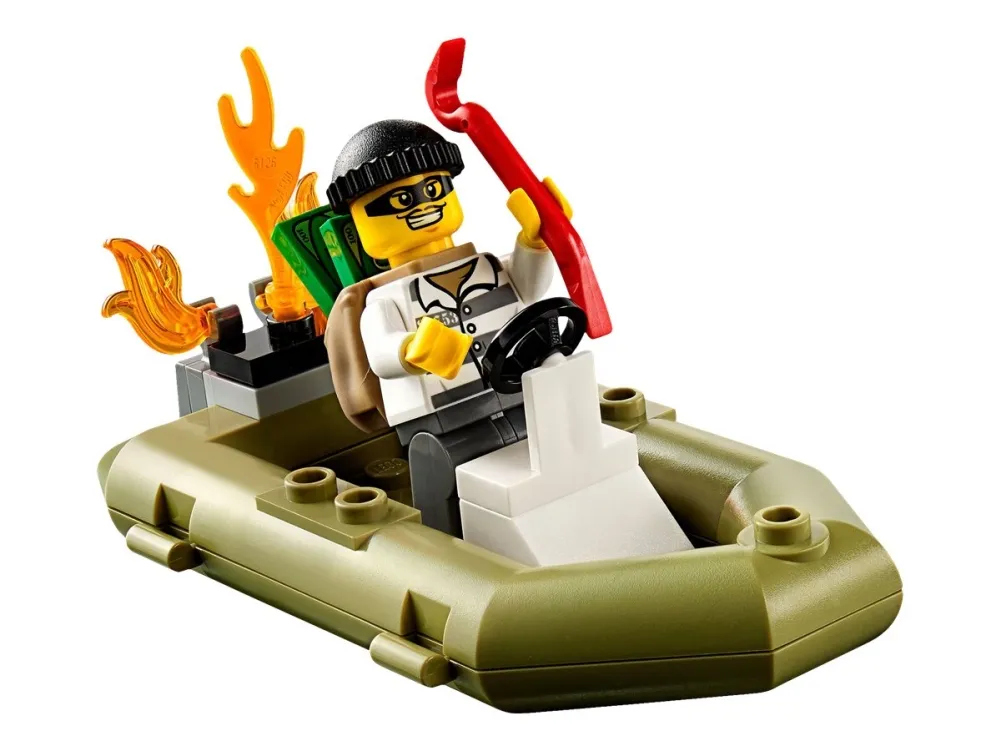 Vrom, vroom ... KABANG! Skurken forsøker å rømme med sekken full av tyvegods om bord i speedbåten sin, men plutselig begynner motoren å brenne! Be brannbåten rykke ut for å slokke brannen! Huff da, skurken trenger visst legehjelp! Hopp om bord i redningshelikoptret, land på vannet og hjelp den sårede skurken. Når du er ferdig, kan du anrope politiet og be dem komme i hurtigbåten sin. Det er på tide å sette håndjern på den forvirrede skurken! Inneholder fem minifigurer med diverse tilbehør: to brannbetjenter, en pilot og en politibetjent.