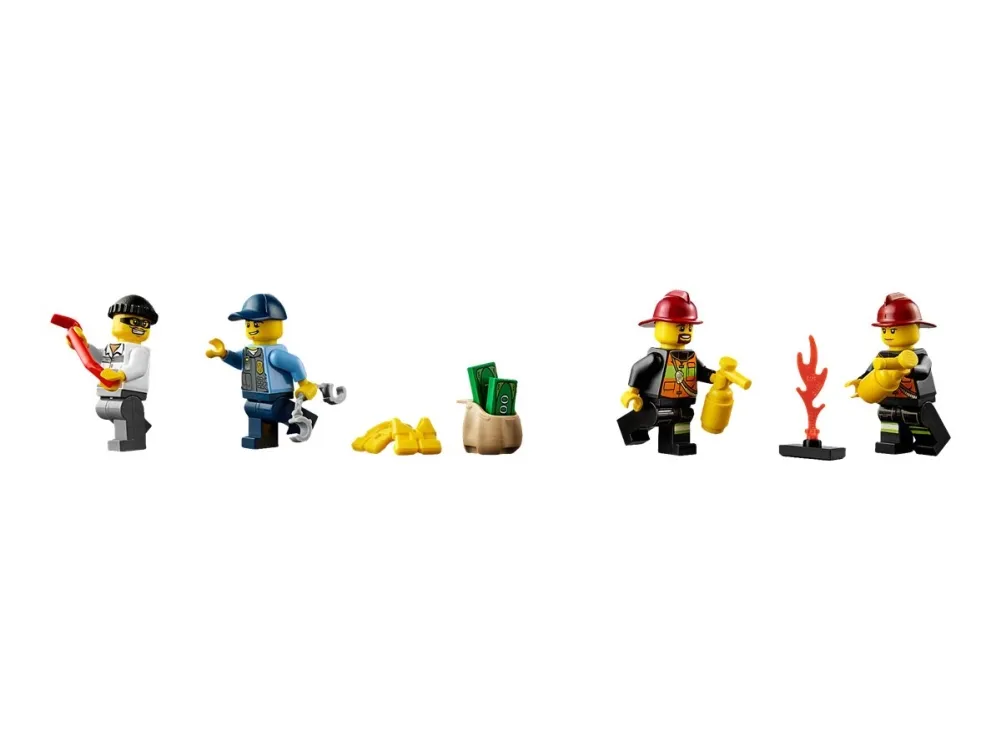 Inneholder 5 minifigurer med diverse tilbehør: 2 brannmenn, en pilot, kjeltring og en politimann. Har et helikopter, politi bil med tilhenger og vannjet, hurtigbåt og fireboat. Helikopteret har en båre. Politiet bil med tilhenger og vannjet inkluderer en walkie - talkie, håndjern og et brannslukningsapparat. Crook båt inkluderer et kubein, ryggsekk, to sedler og flammer. Fireboat inkluderer 2 brannslukkere.