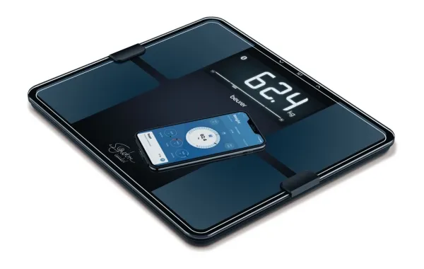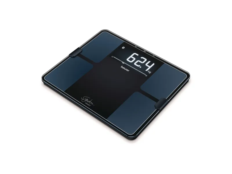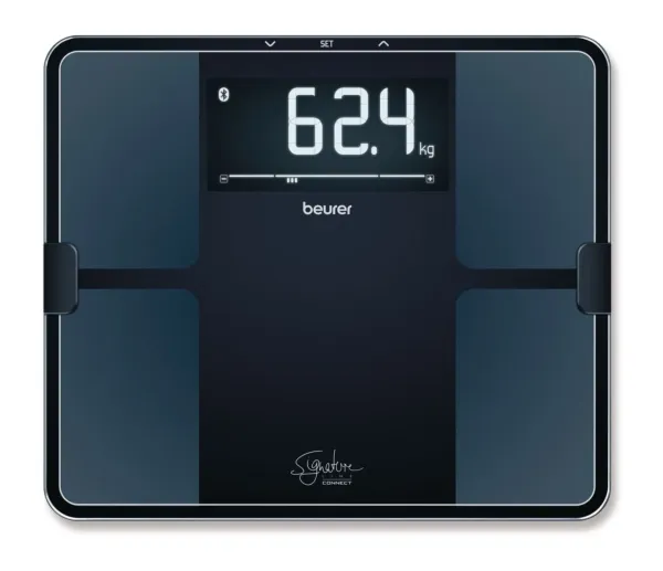 BF 915 Sort kropsanalysevægt fra Beurer Signature Line. Måler både fedt-, muskel-, og vandprocent, knoglemasse, BMI og dagligt kalorieforbrug. 8 brugerhukommelser. Kan både bruges med og uden app. Kapacitet på 200 kg. ITO-belagt vejeflade i 8 mm tykt sikkerhedsglas. Mål: 35x30 cm. Stort display på 69x149 mm med cifferhøjde på 45 mm