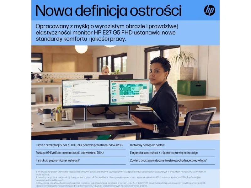 HP E27 G5 FHD-skjermen er bevisst utviklet for å levere skarp grafikk, personlig komfort og ekte fleksibilitet, og omdefinerer komfort, slik at ingenting står mellom deg og ditt beste. Denne skjermen er designet med tanke på miljøet og passer perfekt både på kontoret og hjemme.