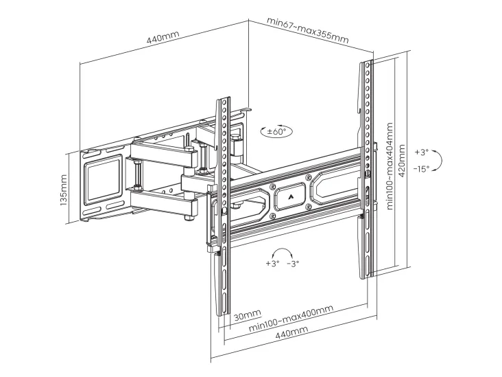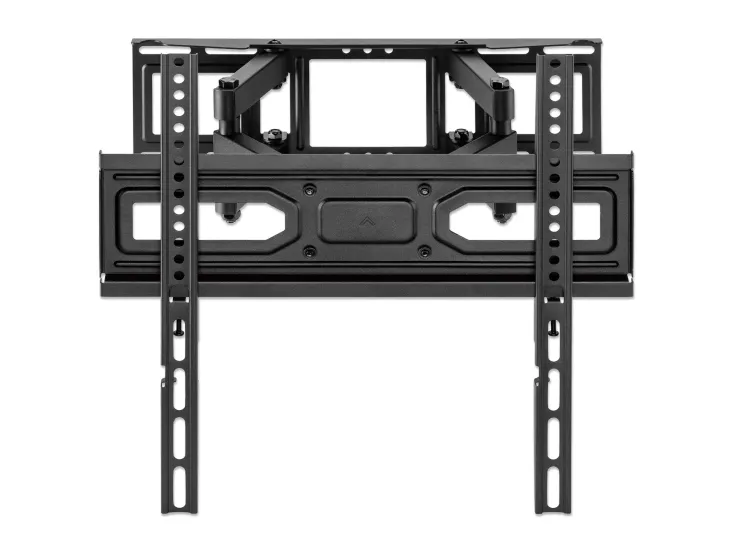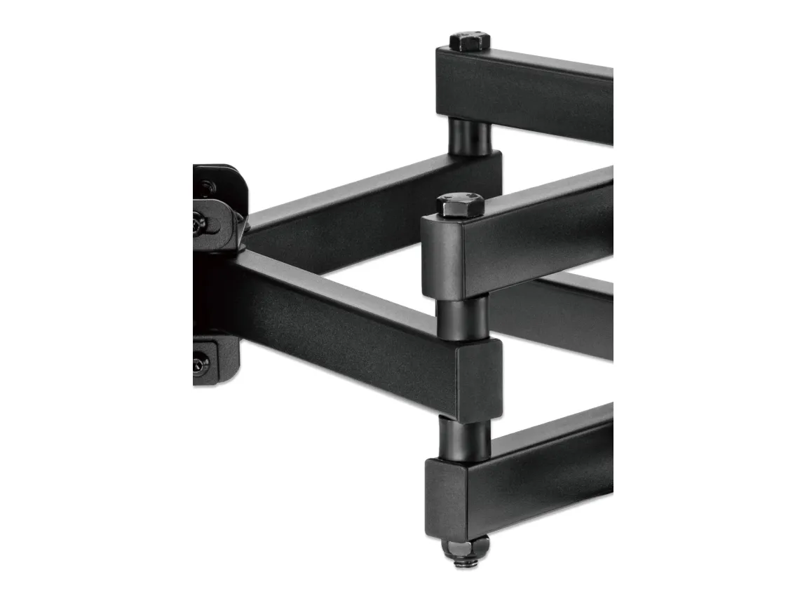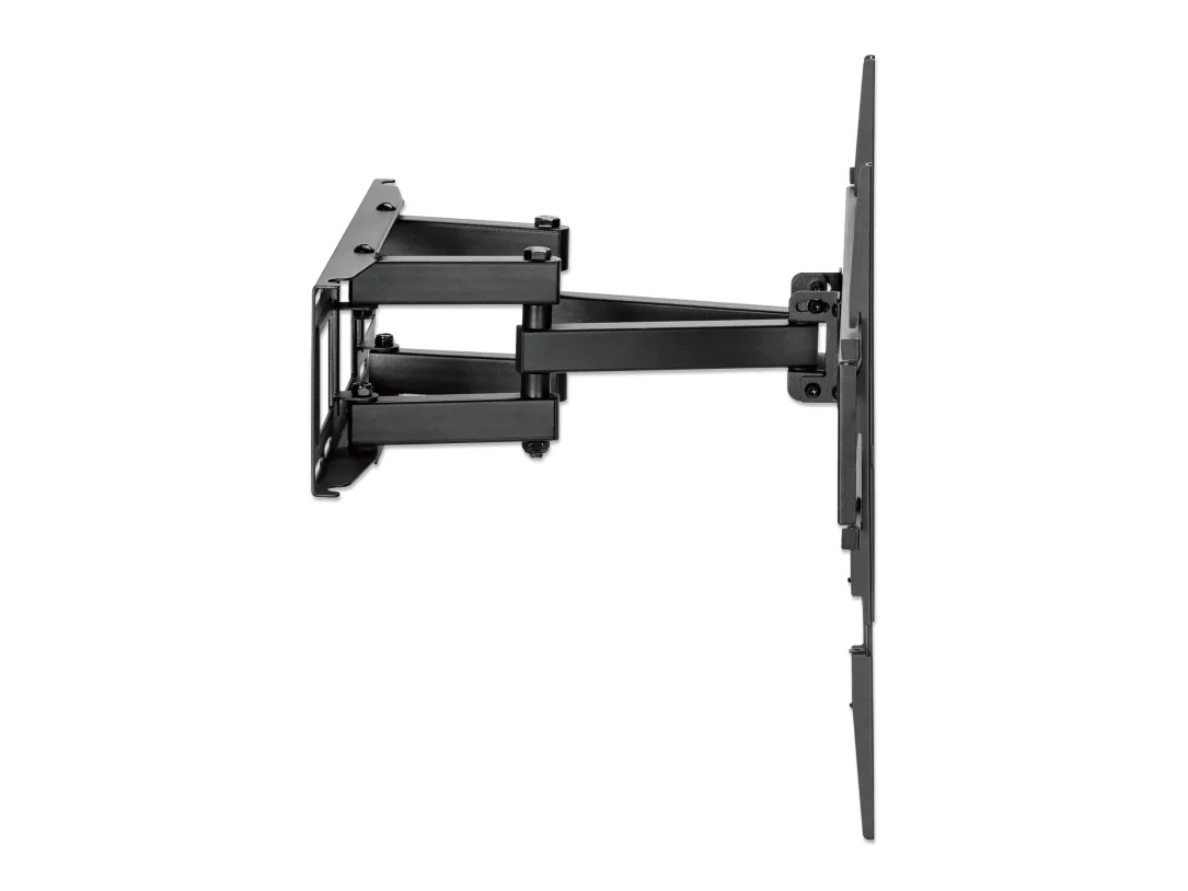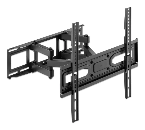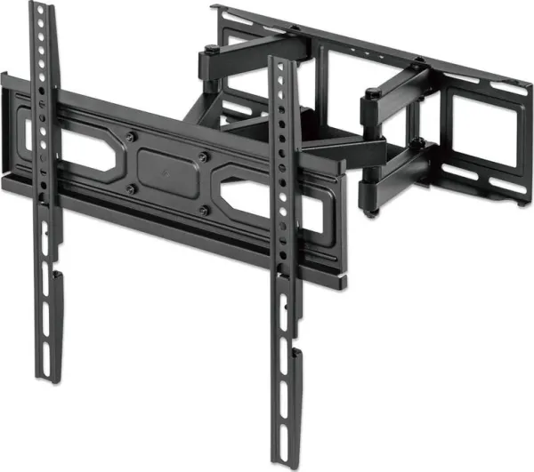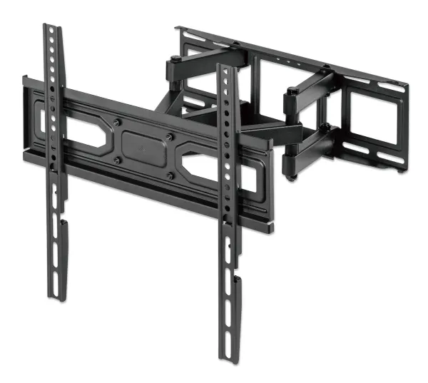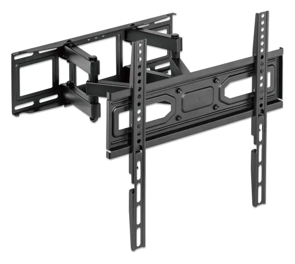 Articulating TV Wall Bracket – fully adjustable mounting bracket to fit almost any space This strong, full-motion TV Wall Mount Bracket from Manhattan safely holds your TV on two articulating arms and provides optimized views with +3 to -15° tilt and +/-60° swivel adjustment. It fits flat and curved LCD, OLED or plasma TVs up to 70"" and weighing up to 40 kg (88 lbs.) with VESA compliance up to 400x400. You're all set for a confident above-the-floor installation with an included bubble level and +/-3° post-leveling adjustment that helps get the mount perfectly horizontal on the wall. This mount is ideal for residential, office, hospitality, classrooms, conference rooms, digital signage and other commercial applications. Wherever you install it, the universal Manhattan Full-Motion TV Wall Mount puts the best TV viewing experience front and center.Manhattan Wall Mount for TV & Monitors (Full Motion), For screens 32" to 55", VESA compatability: all between 100x100mm and 400x400mm - check the dimensions of the four mounting holes on back of screen to ensure it fits, Max 40kg, Black, Bracket, Lifetime Warranty. Maximum weight capacity: 40 kg, Minimum screen size: 81.3 cm (32"), Maximum screen size: 177.8 cm (70"), Minimum VESA mount: 100 x 100 mm, Maximum VESA mount: 400 x 400 mm. Tilt angle range: -15 - 3°, Swivel angle range: -60 - 60°, Distance to the wall (min): 6.7 cm, Distance to the wall (max): 35.5 cm. Product colour: Black