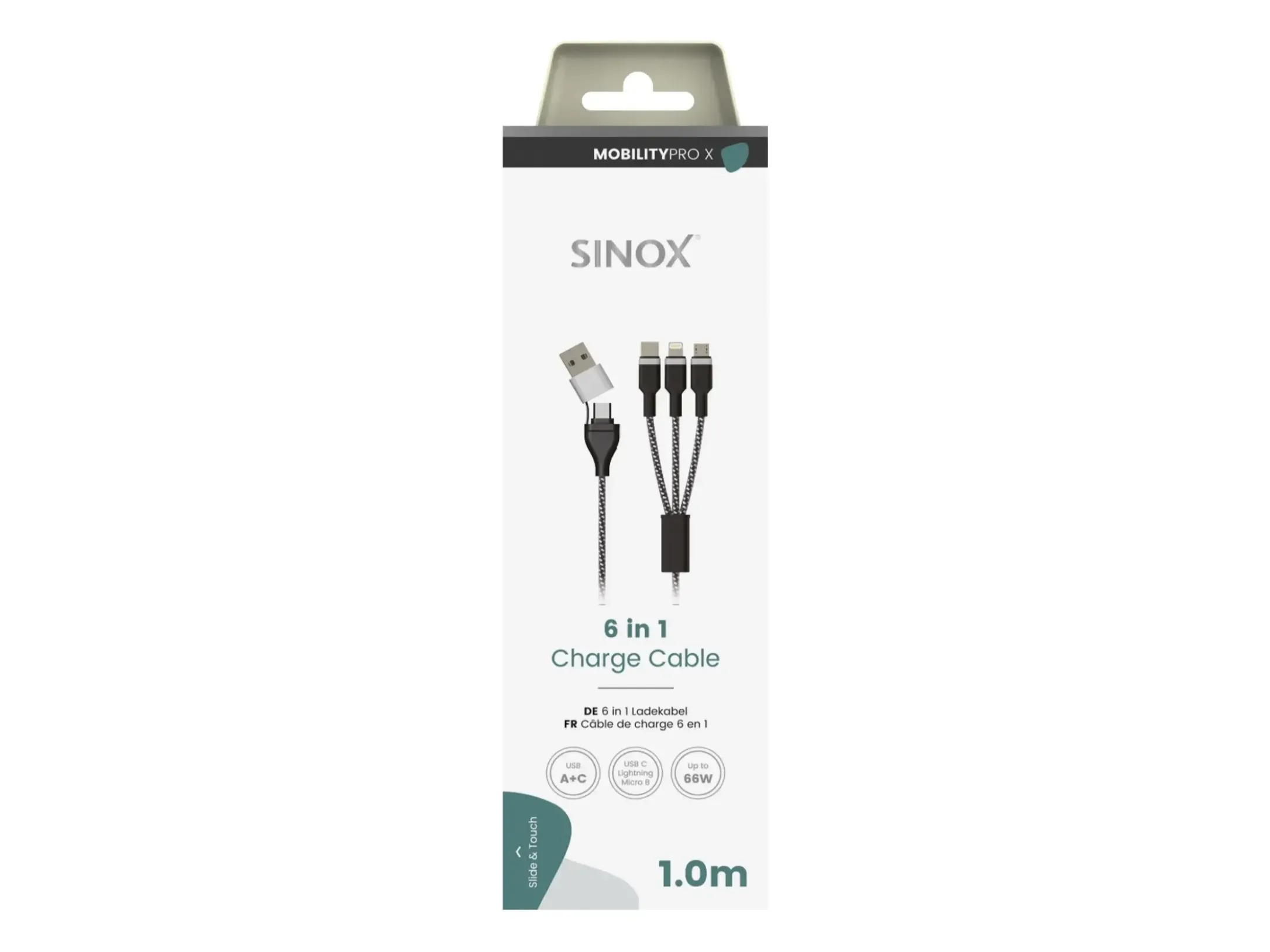 Sinox PRO X 6-i-1 kabel med Lightning, USB C og Micro USB. 1m. Braided. USB A + USB-C (han) til Lightning (han) + USB C (han) + Micro USB (han) Passer til iPhone®, iPad®, Apple Mouse®, Apple TV®-fjernbetjening med Lightning-stik Passer til alle Android®-telefoner Lightning+Micro B: Opladning USB C: Data op til 480 Mbps + Opladning Opladning med op til 66W USB 2.0 Pakket i FSC papæske