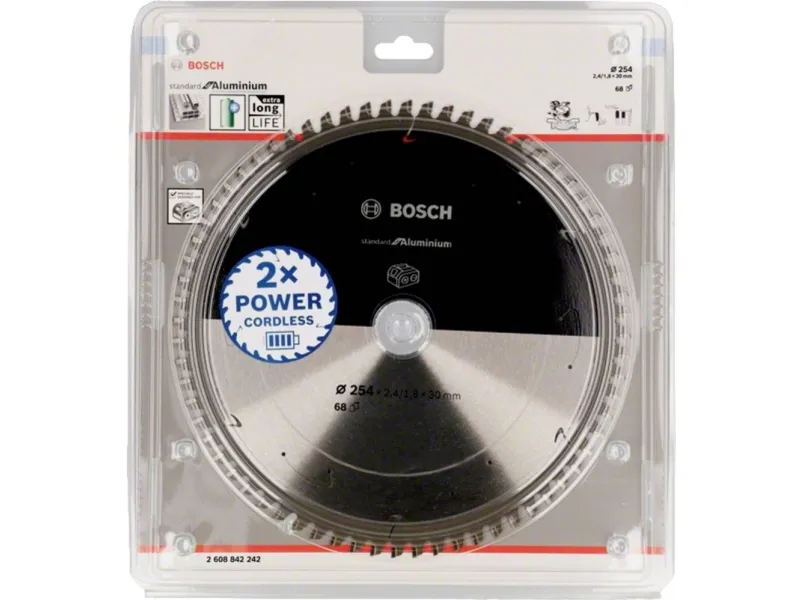Klinger til batteri-rundsave standard for aluminium til kap- og geringssave Maksimal batterilevetid - Rundsavsklinge Standard for aluminium maksimerer batteritiden. Den ekstrasmalle skærekant reducerer friktion og materialefjernelse, så der er brug for mindre effekt til problemfri, ren savning. Carbide-tænder i høj kvalitet sørger for rene snit og præcise resultater. Det er egnet til savning af aluminium og andre ikke-jernmetaller, plast, epoxyharpiks og endda træ. Savklingen passer ved alle gængse batteri-kapsave og -geringssave. Rundsavsklinge standard for aluminium gør det muligt med sine eksklusive Carbide-tænder at få rene savsnit og præcise resultater. Forlængelsesslidser reducerer støjudviklingen betydeligt. Boringen fungerer med eller uden reduktionsringe til forskellige størrelser
