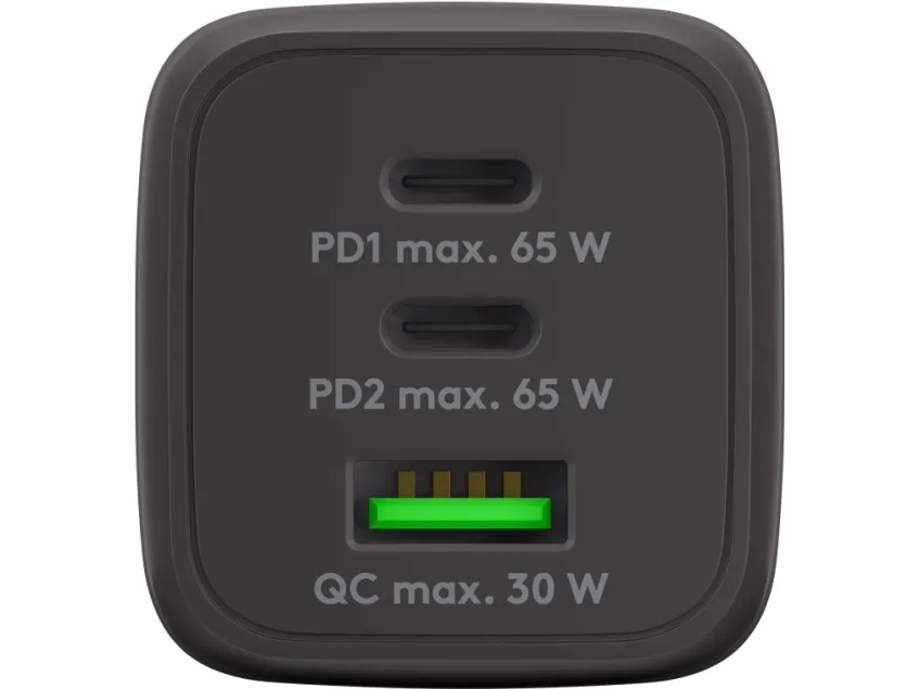 USB-C1: max. 65.0 WUSB-C2: max. 65.0 WUSB-A: max. 30.0 WUSB-C1 + USB-C2: max. 45.0 W + 20.0 W (Total 65.0 W)USB-C1 + USB-A: max. 45.0 W + 18.0 W (Total 63.0 W)USB-C2 + USB-A: max. 5.0V max. 1.5 A (7.5 W) + 5.0 V max. 1.5A (7.5 W) Total 15.0 WUSB-C2 + USB-A + USB-C1: max. 7.5 W + 7.5 W + 45.0 W (Total max. 60W)Total: max. 65.0 W USB-C1:5.0 V max. 3.0 A (15.0 W)9.0 V max. 3.0 A (27.0 W)12.0 V max. 3.0 A (36.0 W)15.0 V max. 3.0 A (45.0 W)20.0 V max. 3.25 A (65.0 W)PPS: 3.3 V – 20.0 V max. 3.0 A (60.0 W) USB-C2:5.0 V max. 3.0 A (15.0 W)9.0 V max. 3.0 A (27.0 W)12.0 V max. 3.0 A (36.0 W)15.0 V max. 3.0 A (45.0 W)20.0 V max. 3.25 A (65.0 W)PPS: 3.3 V – 20.0 V max. 3.0 A (60.0 W) USB-A:4.5 V max. 5.0 A (22.5 W)5.0 V max. 4.5 A (22.5 W)9.0 V max. 3.0 A (27.0 W)12.0 V max. 2.5 A (30.0 W)20.0 V max. 1.5 A (30.0 W)